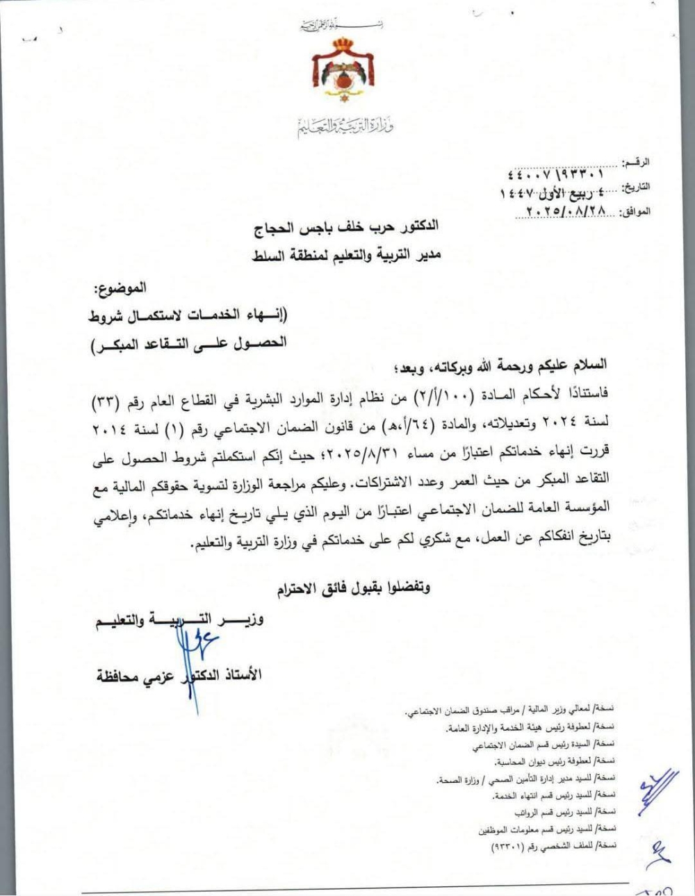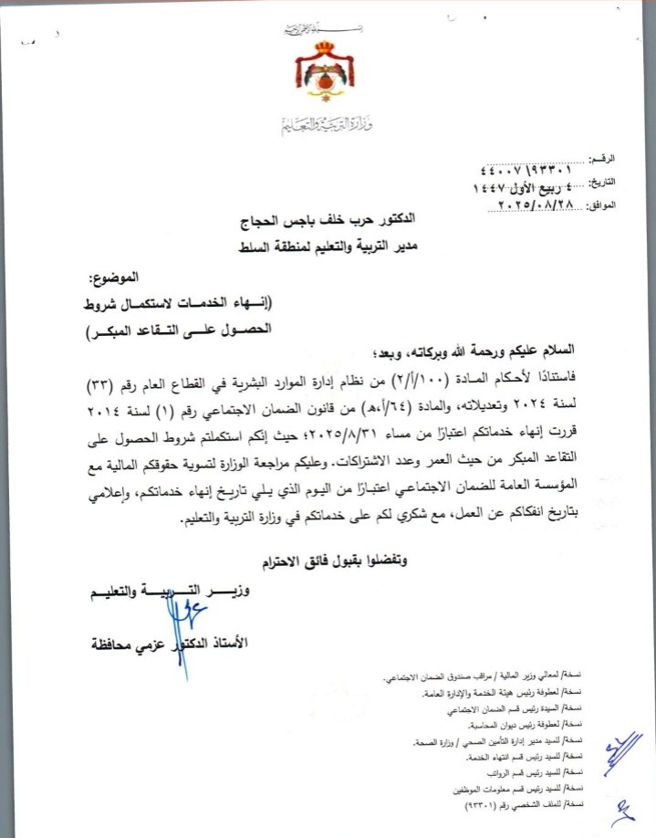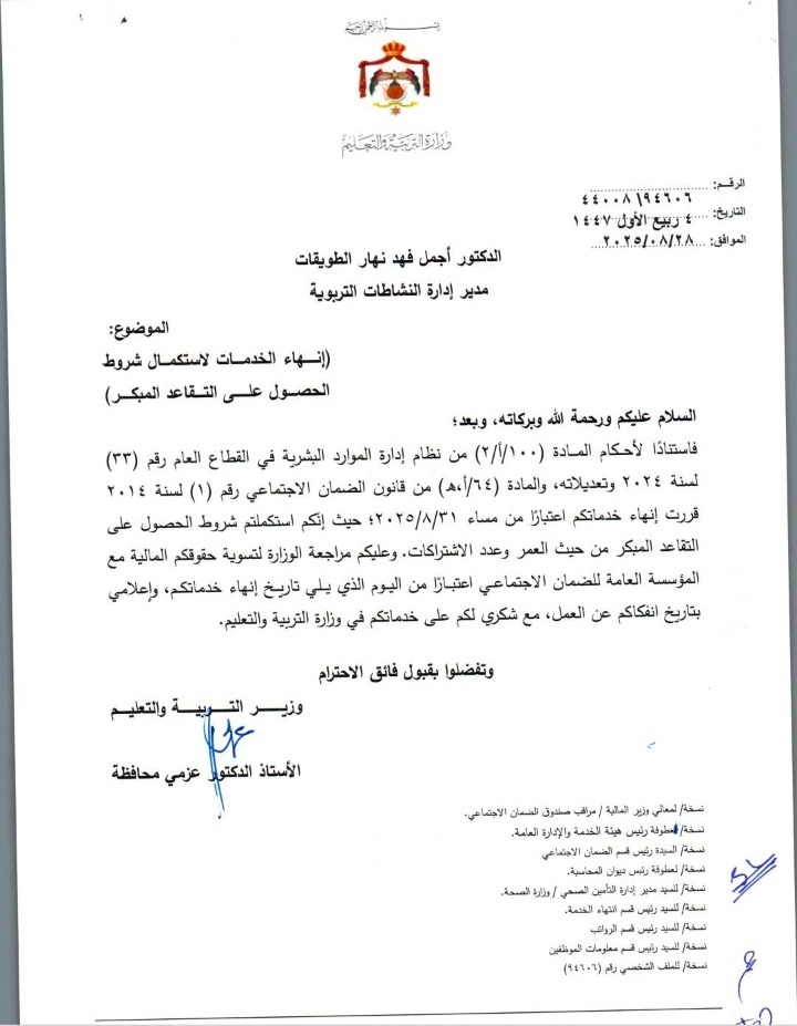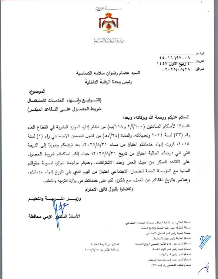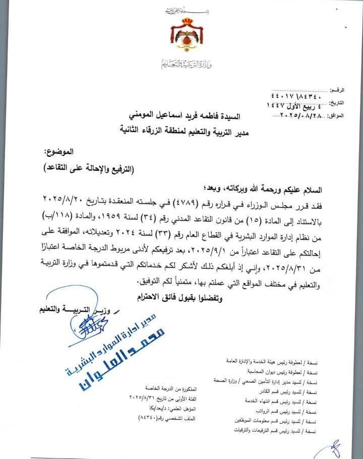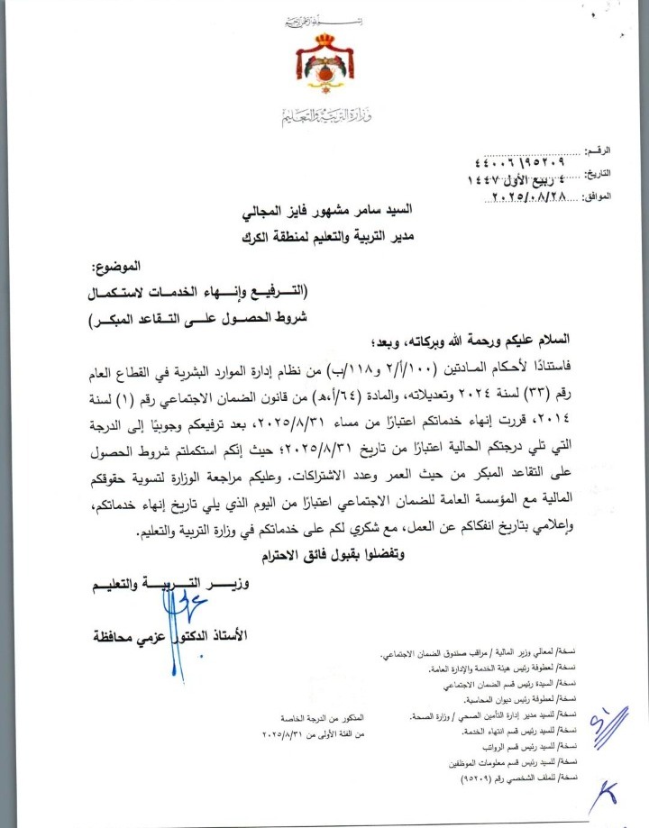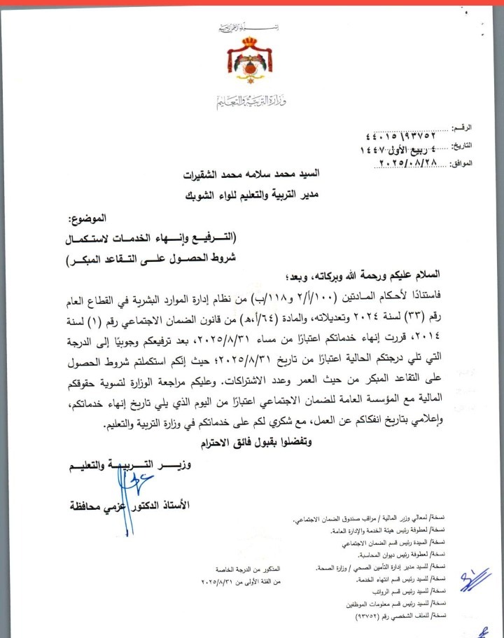 قرر وزير التربية والتعليم الدكتور عزمي محافظة، اليوم الخميس، إحالة موظفين إلى التقاعد وترفيع آخرين، وتاليا الأسماء والتفاصيل: