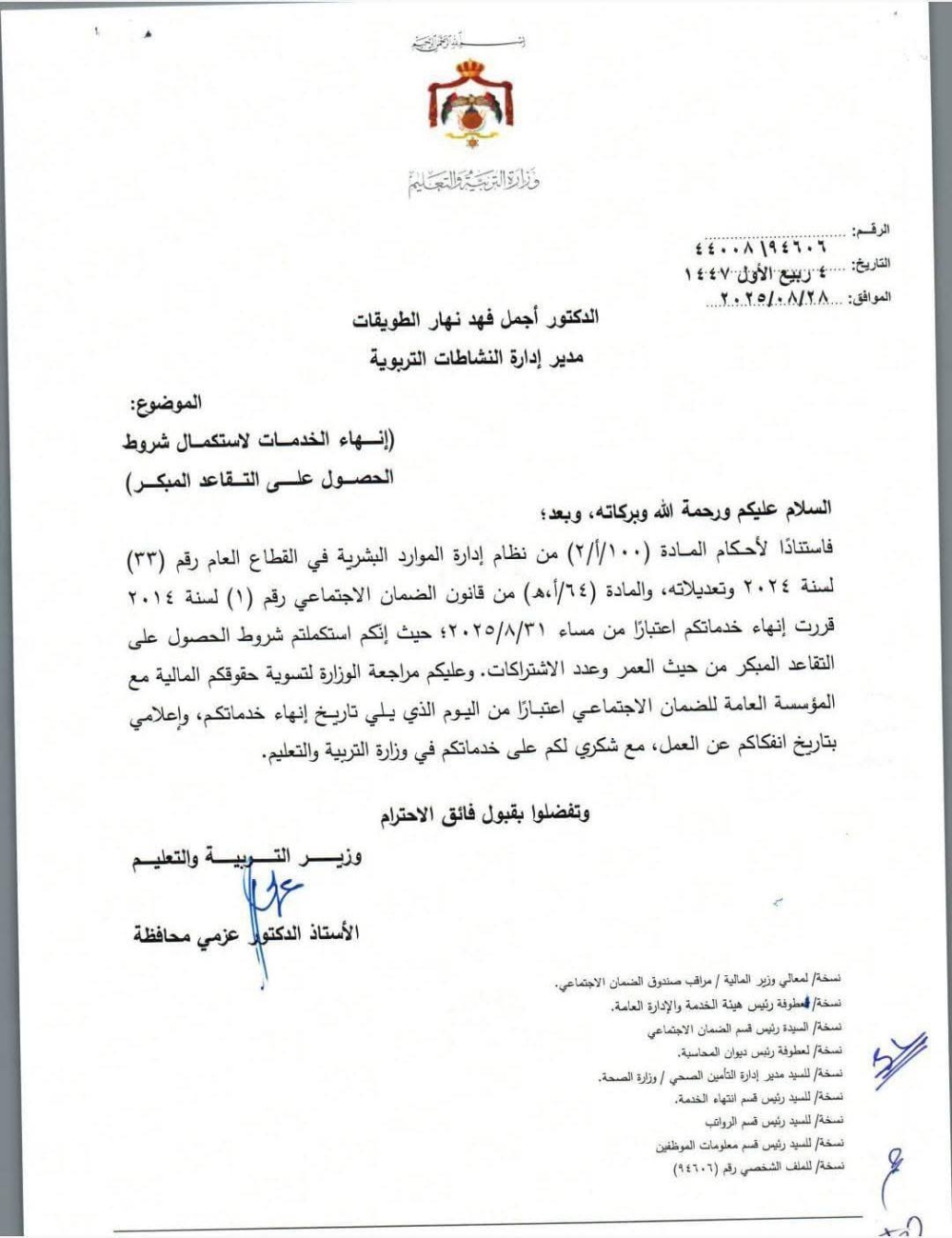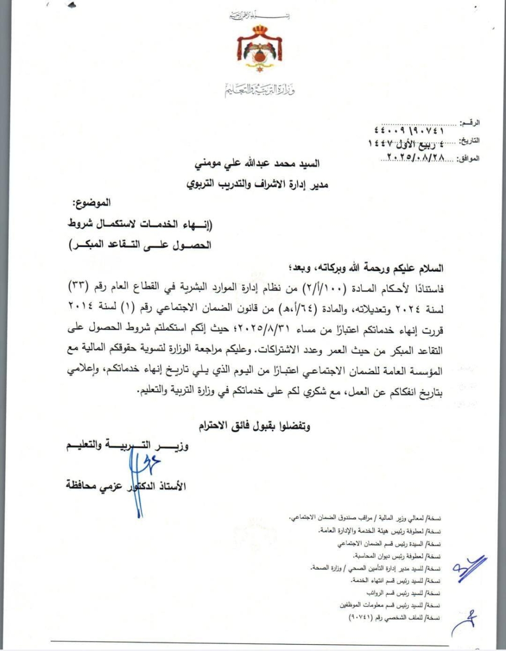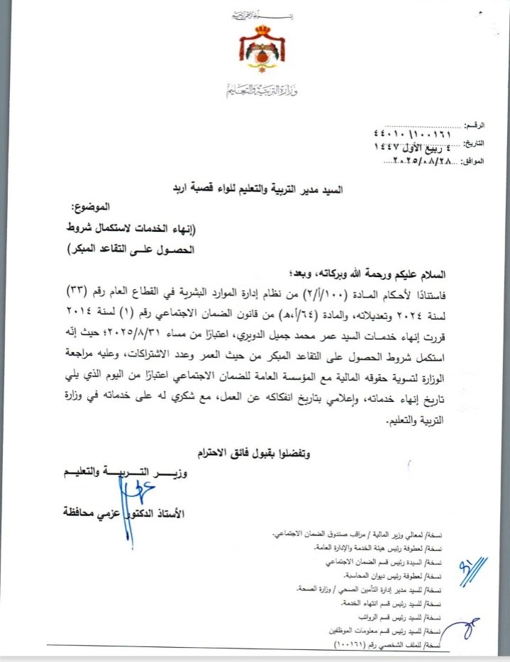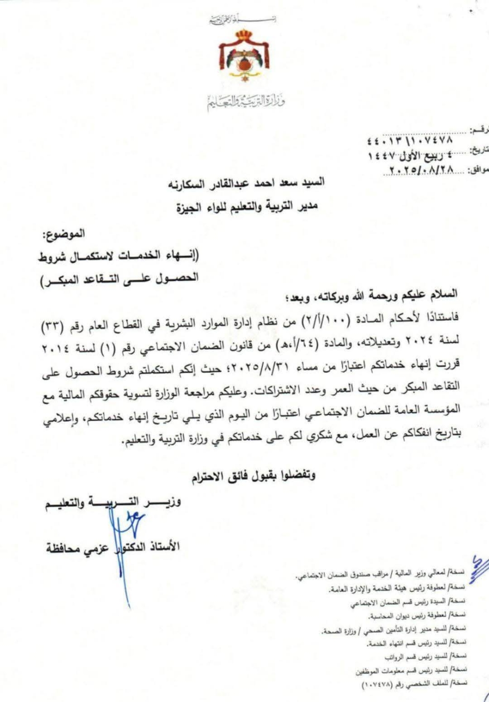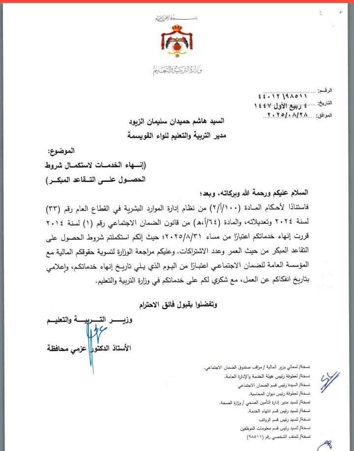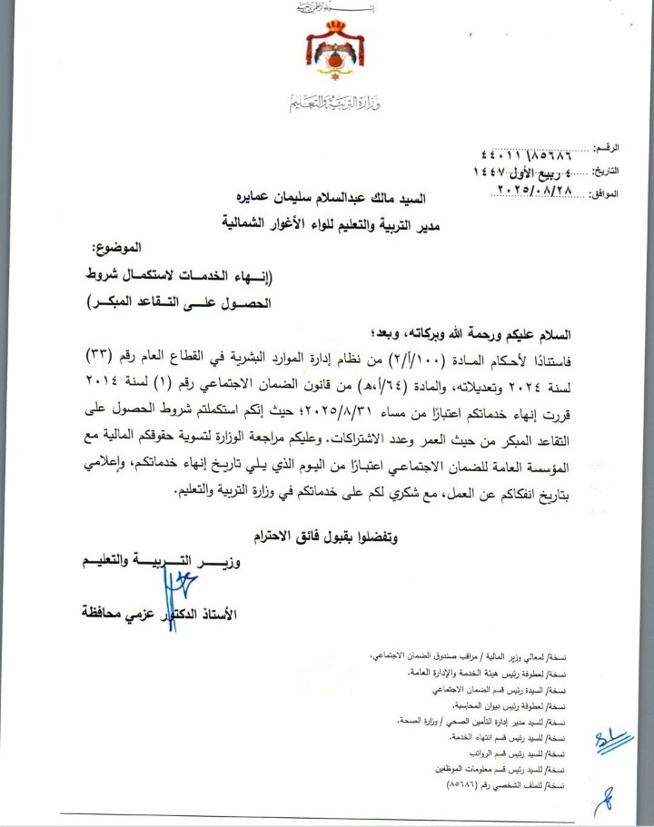 قرر وزير التربية والتعليم الدكتور عزمي محافظة، اليوم الخميس، إحالة موظفين إلى التقاعد وترفيع آخرين، وتاليا الأسماء والتفاصيل: