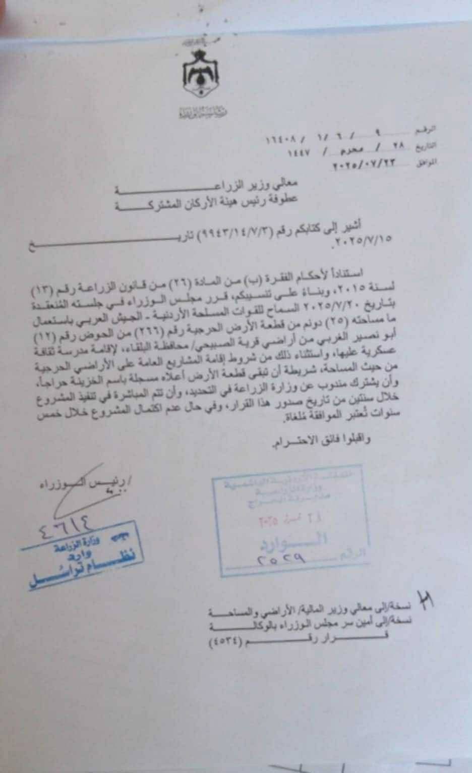 قرر مجلس الوزراء في جلسته المنعقدة بتاريخ 22 تموز 2025، الموافقة على طلب القوات المسلحة الأردنية – الجيش العربي، باستعمال مساحة تبلغ (35) دونماً من قطعة الأرض الحرجية رقم (216) في حوض رقم (12) أبو نصير الغربي من أراضي قرية الصبيحي في محافظة البلقاء ، وذلك لإقامة مدرسة ثانوية عسكرية.