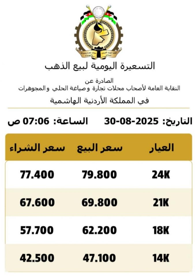وسجل سعر بيع الغرام من الذهب عيار 21، وهو الأكثر تداولًا بين المواطنين، 69.80 دينار لغايات البيع لدى محلات الصاغة، مقابل 67.60 دينار للشراء.