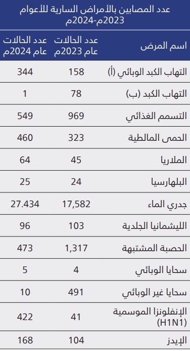 وفي المقابل شهدت بعض الأمراض تراجعا ملحوظا، إذ انخفضت إصابات التهاب الكبد الوبائي (ب) إلى حالة واحدة فقط مقارنة بـ78 حالة، كما تراجعت حالات التسمم الغذائي إلى 549 مقابل 969، وانخفضت إصابات الليشمانيا الجلدية إلى 96 حالة مقارنة بـ103 حالات خلال 2023.