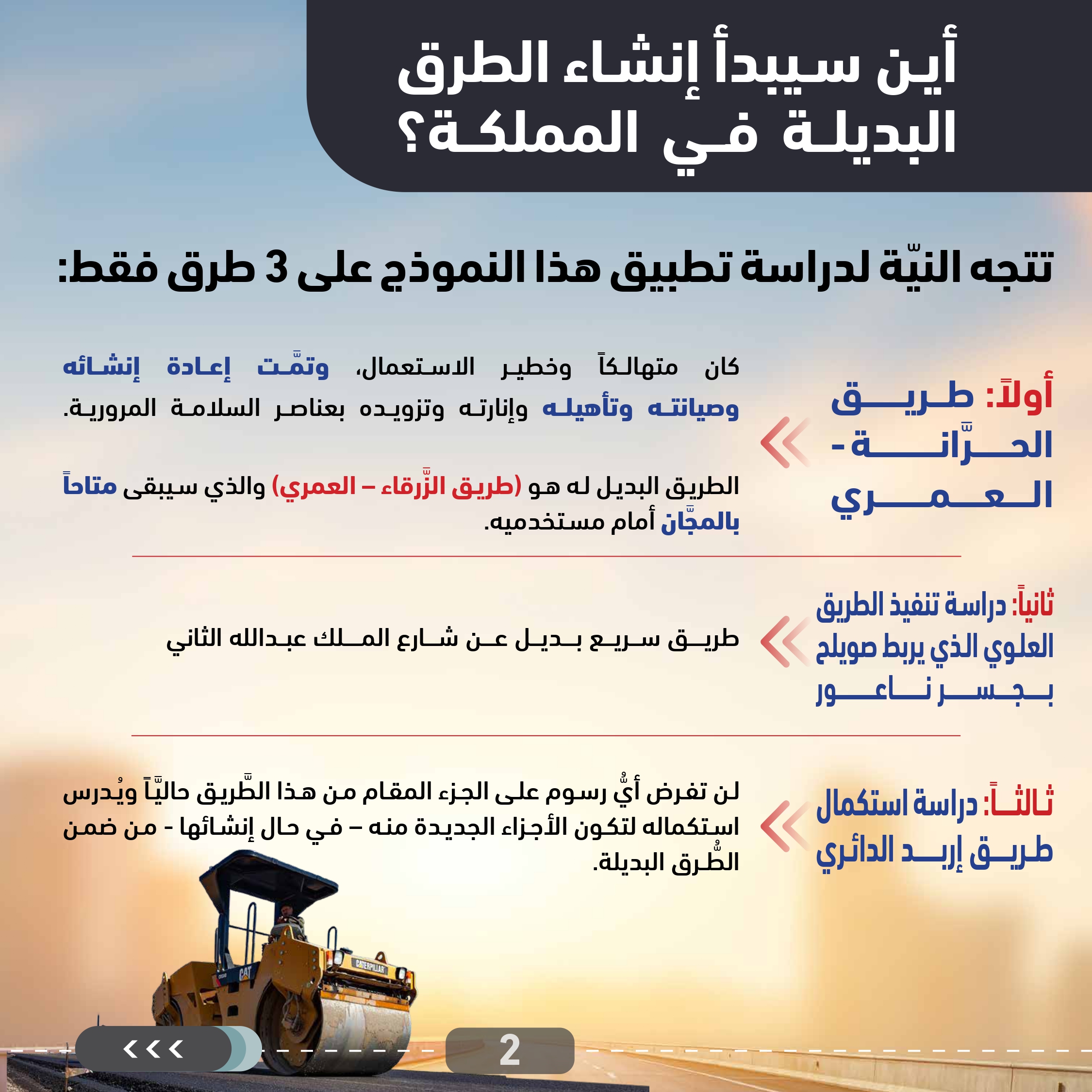 وأكد الناطق الإعلامي باسم الوزارة، عمر المحارمة، أن هذا المشروع لن يتضمن فرض أي رسوم أو ضرائب على الطرق القائمة سواء كانت رئيسة أو فرعية، مشددًا على أن الطرق البديلة ستكون اختيارية بالكامل، وتأتي كخيار إضافي يتيح للمواطنين والمستثمرين الاستفادة من طرق ذات مواصفات أعلى وخدمات مرافقة أكثر تطورًا.