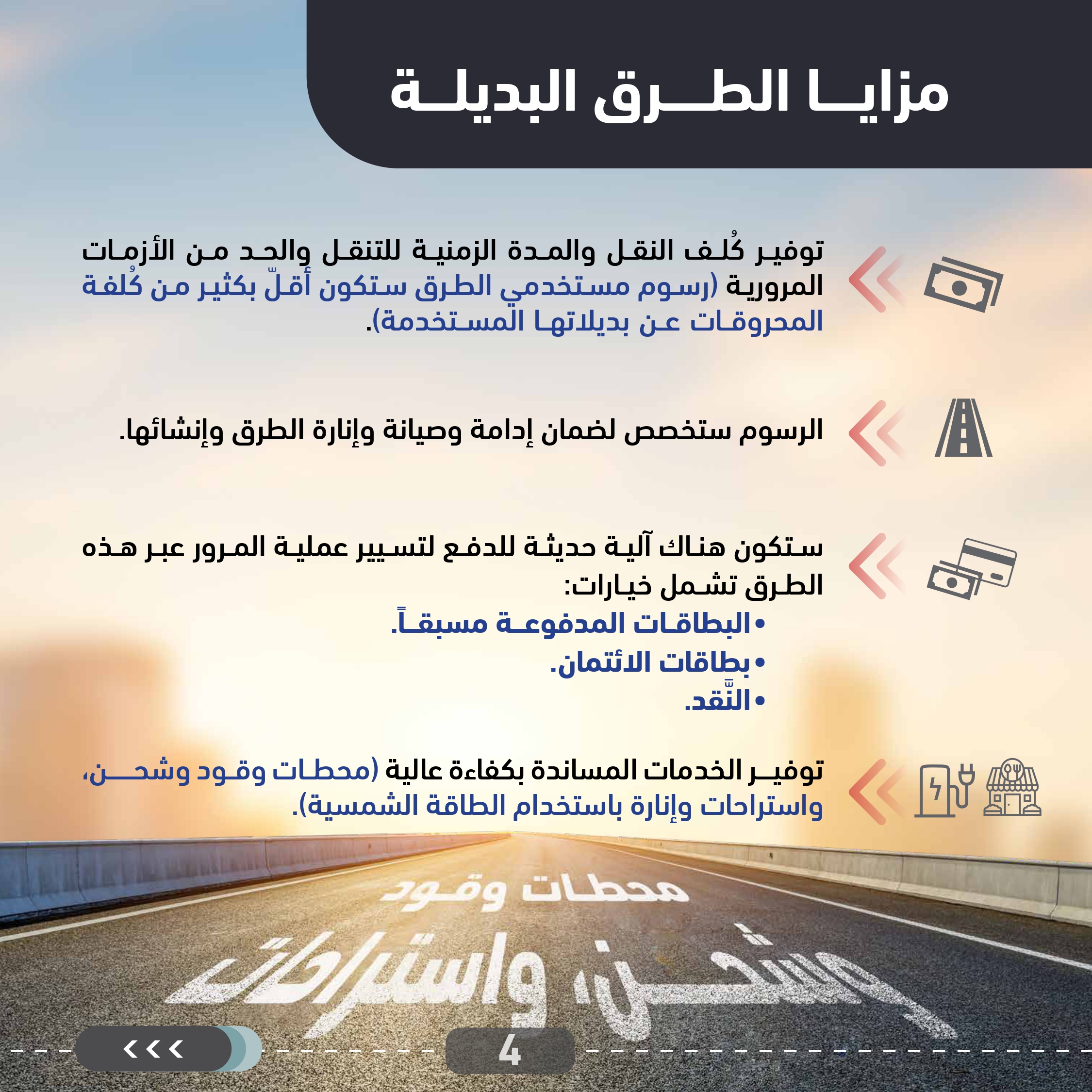 وستُستخدم عوائد هذه الرسوم في تغطية النفقات التشغيلية والصيانة والإنارة، مع ضمان أن تبقى الطرق الأساسية مجانية لجميع المواطنين.