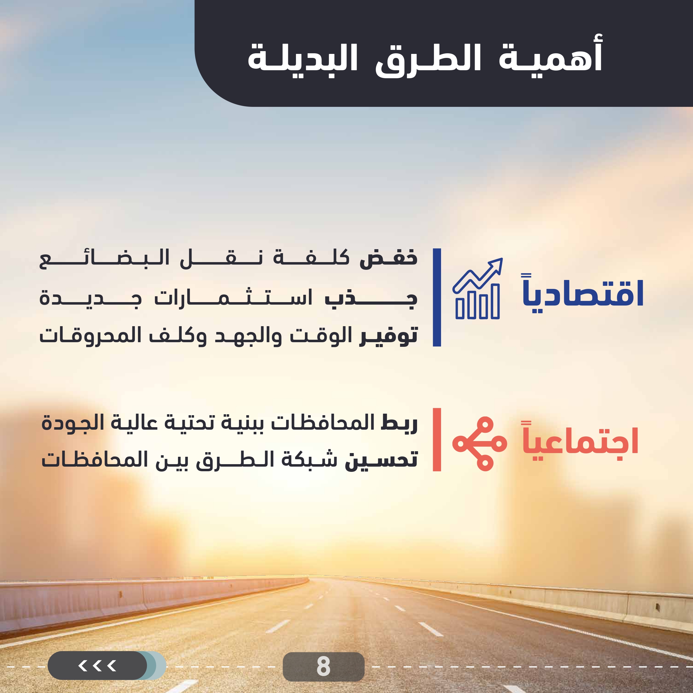 كما ستتضمن الطرق البديلة خدمات مرافقة مثل: محطات وقود حديثة، واستراحات للمسافرين، وإنارة تعمل بالطاقة الشمسية، ومناطق خدمات لوجستية تدعم قطاع النقل والشحن.