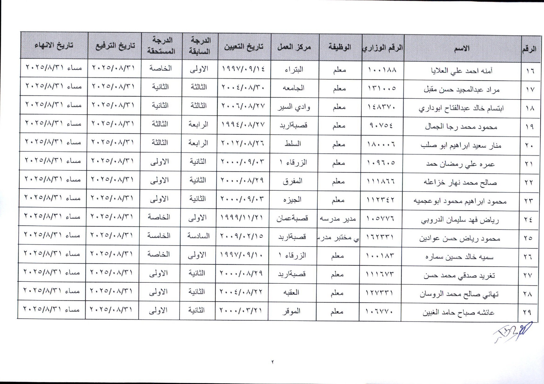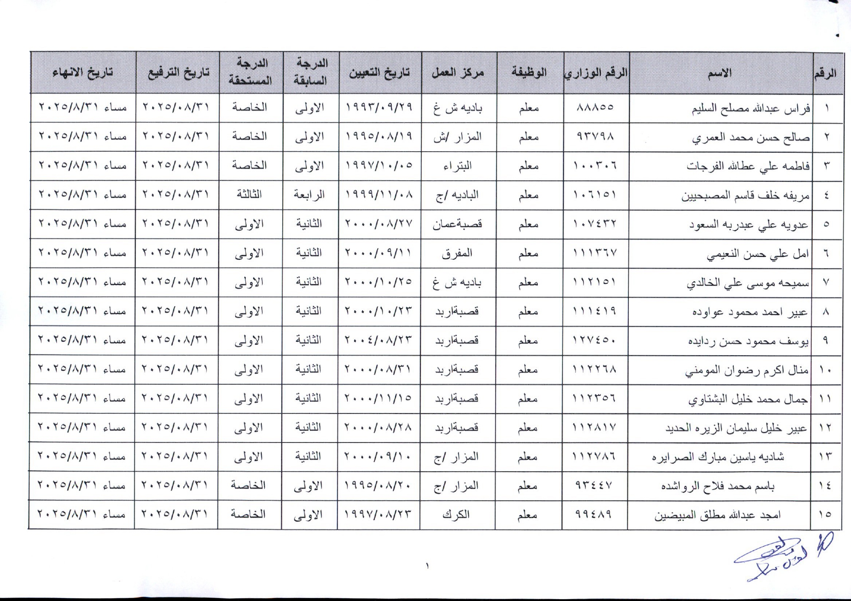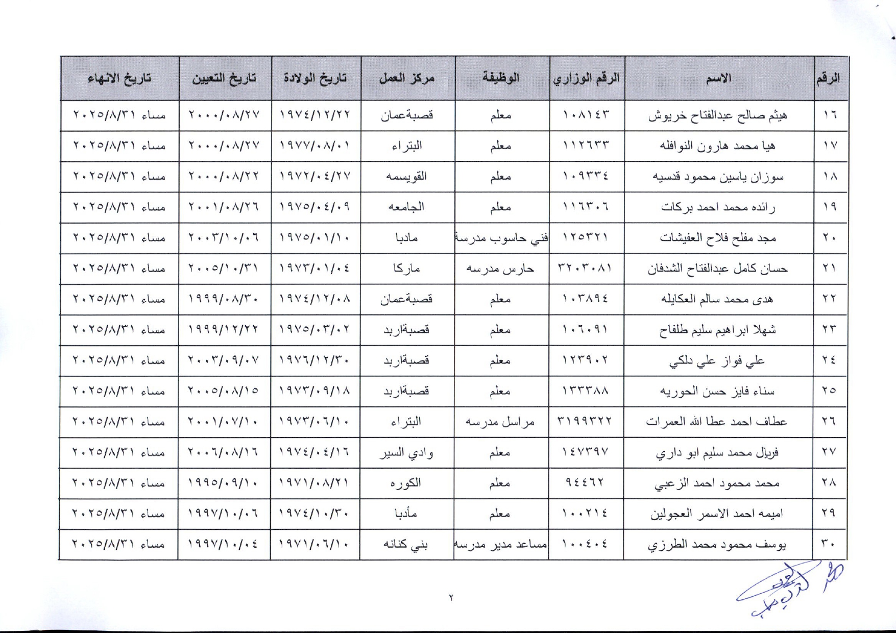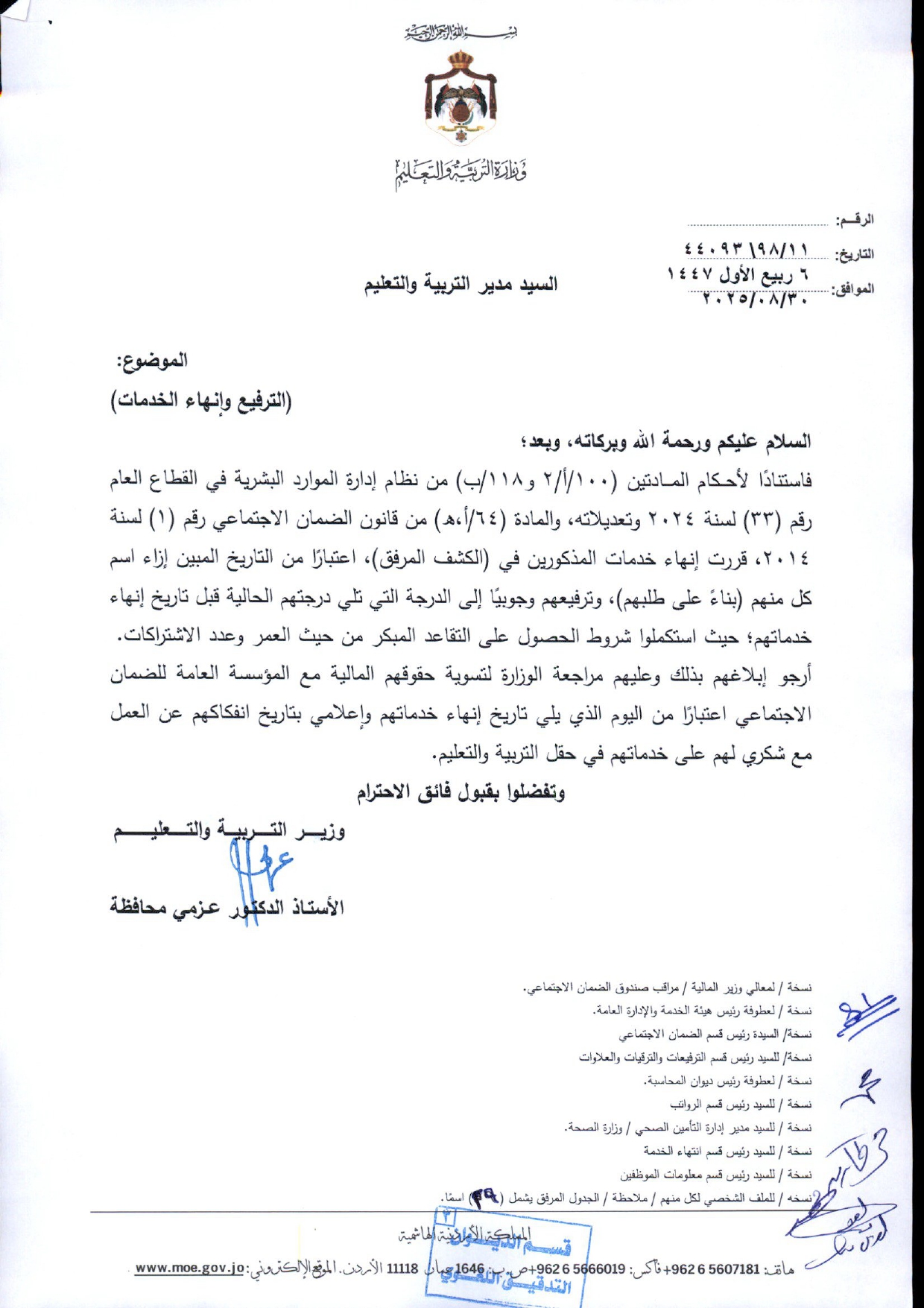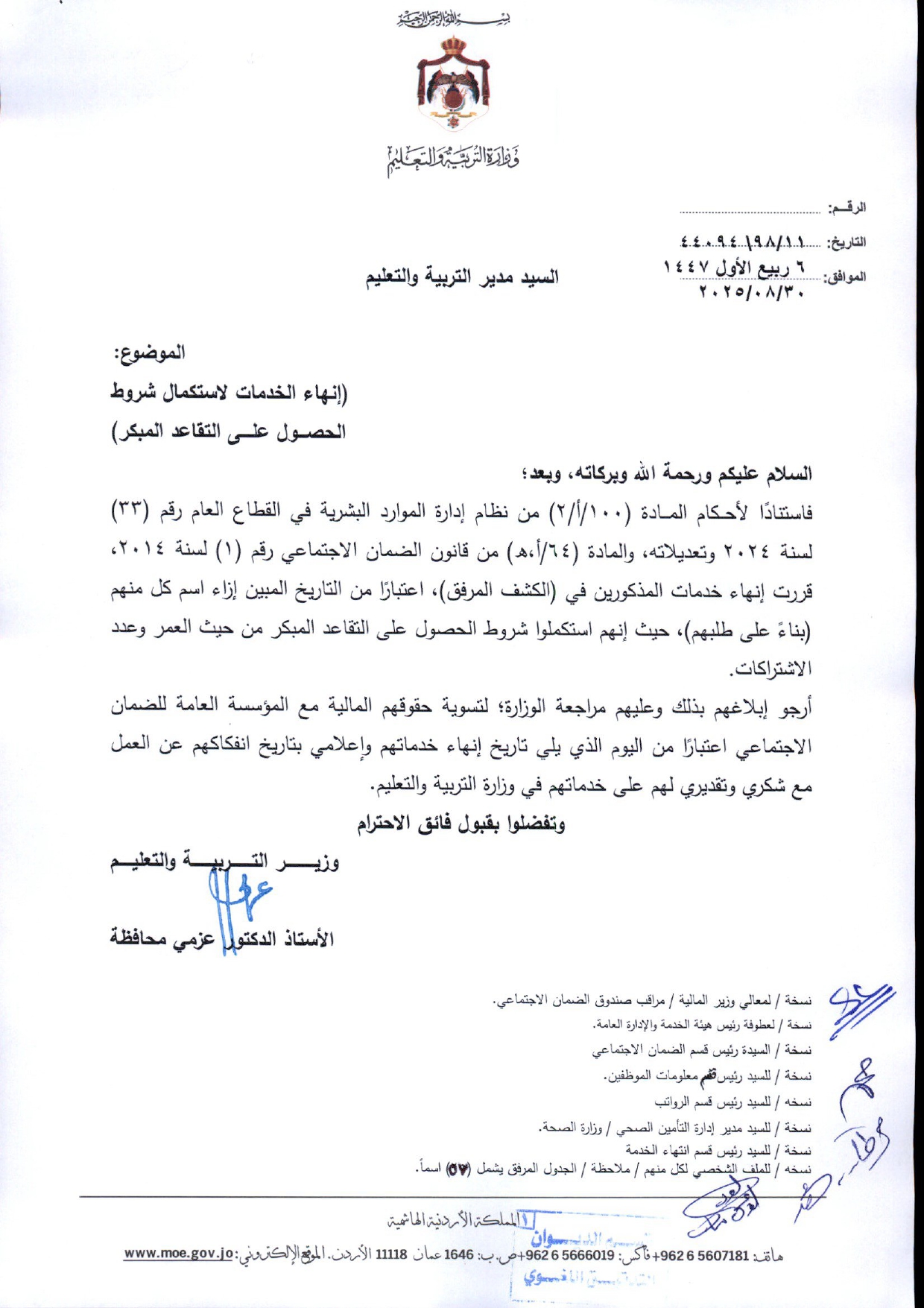 قرر وزير التربية والتعليم، الدكتور عزمي محافظة، إنهاء خدمات عدد من الموظفين في الوزارة بعد استكمالهم شروط الحصول على التقاعد المبكر من حيث العمر وعدد الاشتراكات، وترفيع آخرين وإنهاء خدماتهم.