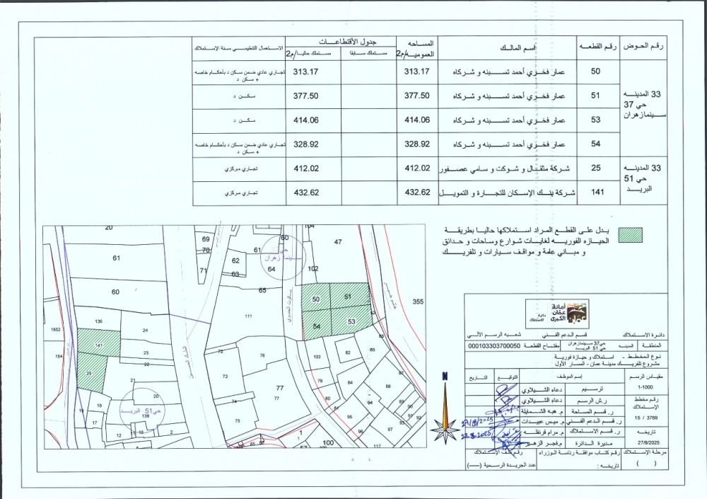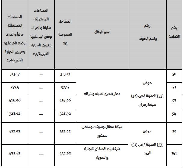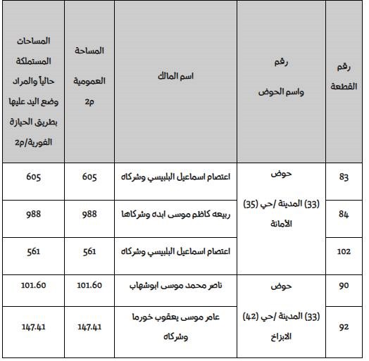 وأوضحت الأمانة أنّ هذه الاستملاكات تشمل قطع أراضٍ محددة جرى توثيق تفاصيلها في الجداول والمخططات الرسمية، حيث تتوزع بين أرقام وأسماء الأحواض ومالكيها.