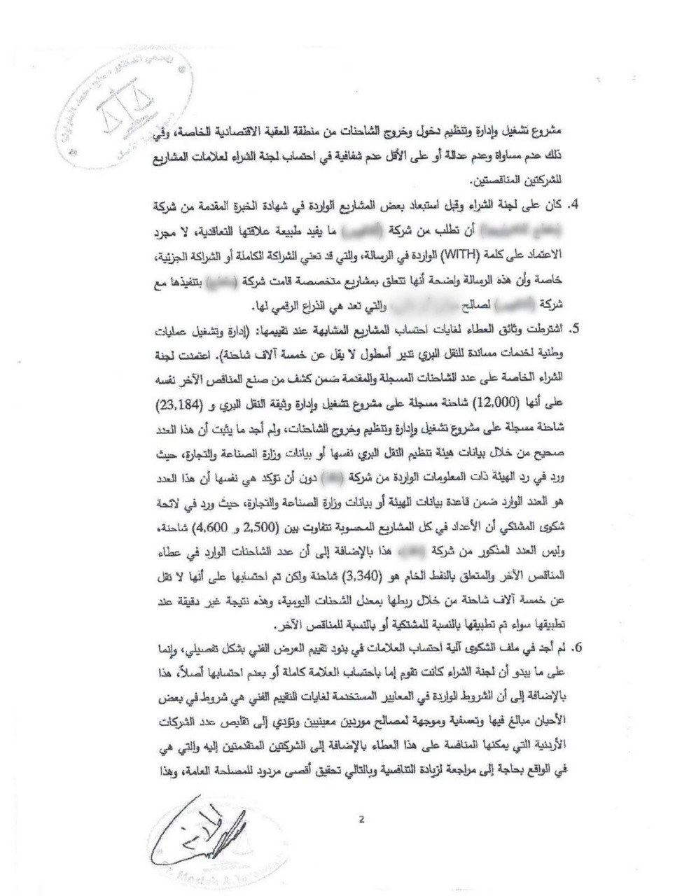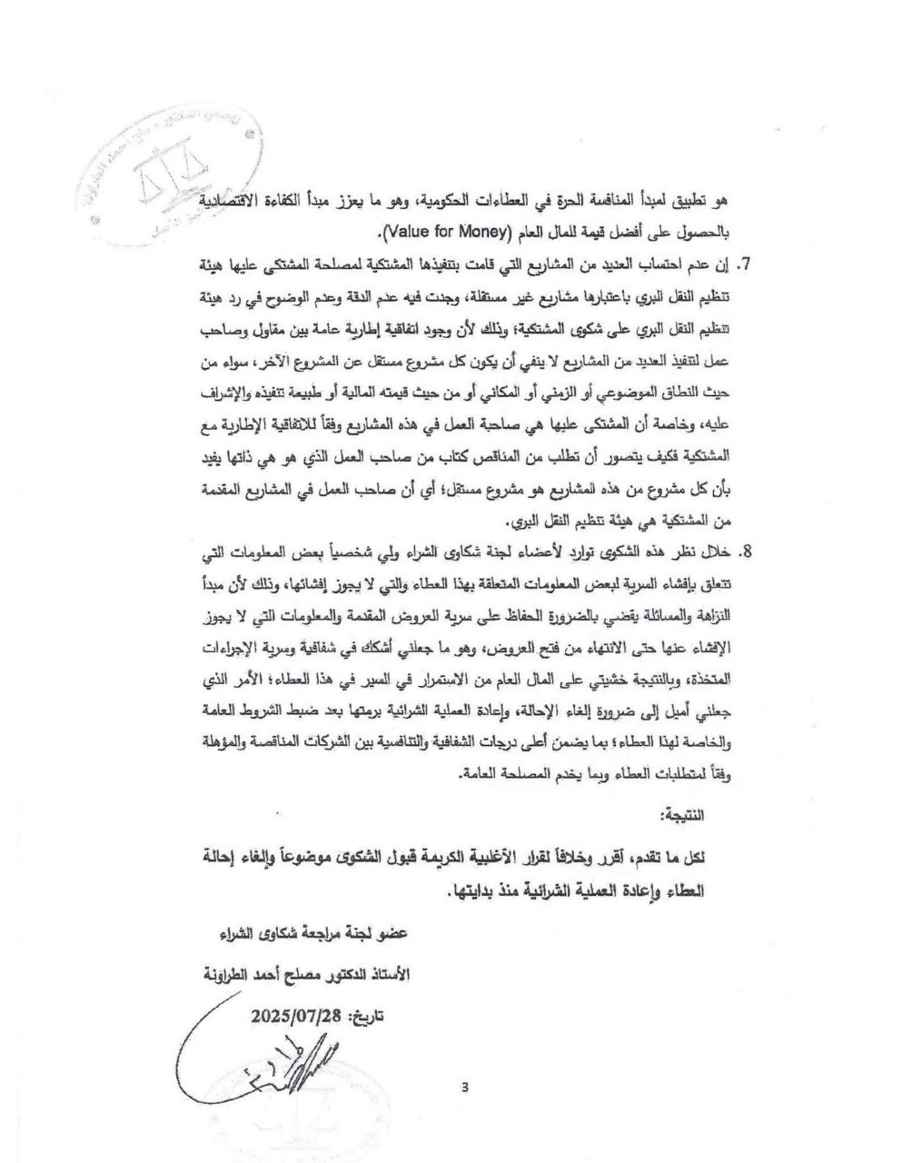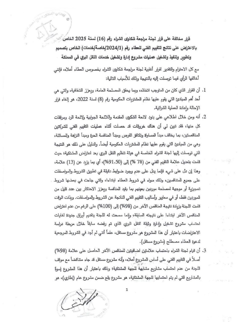كما دلّل أبو رمان على وجود شكوى داخلية ضمن الوثائق الرسمية من النائب الأسبق مصلح الطراونة، رئيس جمعية المحكمين الأردنيين، تفيد بأن اللجنة تغاضت عن مخالفات جوهرية في المواصفات الفنية لصالح الشركة محل الاعتراض، وأن المفاضلة الفنية لم تُطبق بعدالة بين المتنافسين، مع غياب واضح لمسطرة العدالة في احتساب العلامة الفنية لشهادات الخبرة والقدرة الفنية.