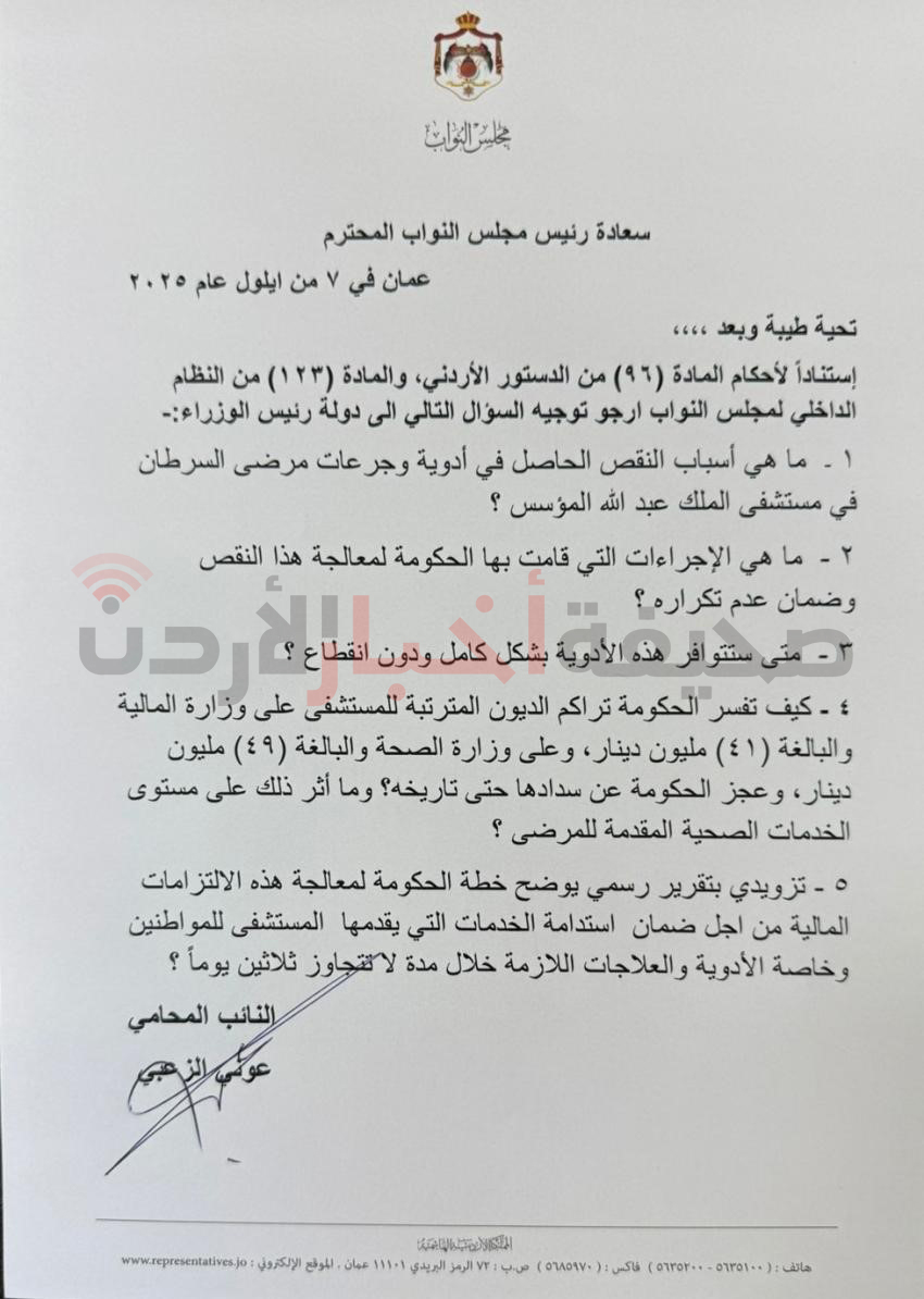 وطالب الزعبي الحكومة بتقديم تقرير رسمي خلال 30 يوماً يوضح خطتها لمعالجة الالتزامات المالية المترتبة على المستشفى، وضمان استدامة خدماته العلاجية، خصوصاً ما يتعلق بتوفير الأدوية والجرعات اللازمة لمرضى السرطان.