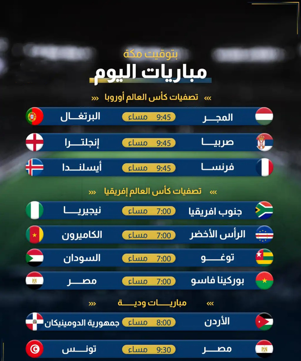 ويواجه منتخب البرتغال بقيادة رونالدو مضيفه المجر في مباراة حاسمة ضمن تصفيات أوروبا، بينما يحل منتخب فرنسا بقيادة مبابي ضيفاً على أيسلندا، ويخوض منتخب إنجلترا مواجهة صعبة أمام صربيا في نفس التصفيات.
