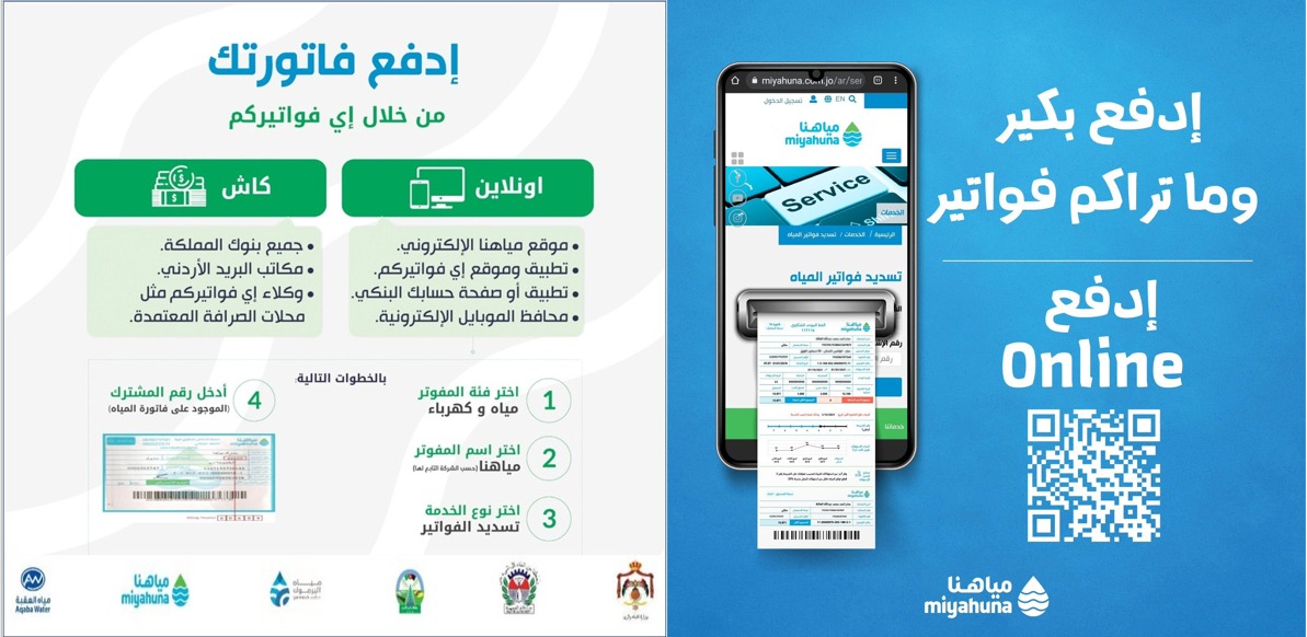 أكدت وزارة المياه والري/سلطة المياه على أهمية التوسع في استخدام الخدمات الإلكترونية التي تم إطلاقها خلال الفترة الماضية بالتعاون مع شركات المياه: شركة مياه الأردن "مياهنا"، شركة مياه اليرموك، وشركة مياه العقبة، مشيرة إلى أن هذه الخدمات تهدف إلى تسهيل الإجراءات وتوفير الوقت والجهد على المواطنين.