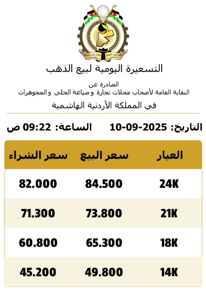 وبحسب النشرة اليومية الصادرة عن النقابة العامة لأصحاب محلات تجارة وصياغة الحلي والمجوهرات، بلغ سعر غرام الذهب لعيارات 24 و18 و14 لغايات البيع 84.5 و65.3 و49.8 دينار على التوالي.