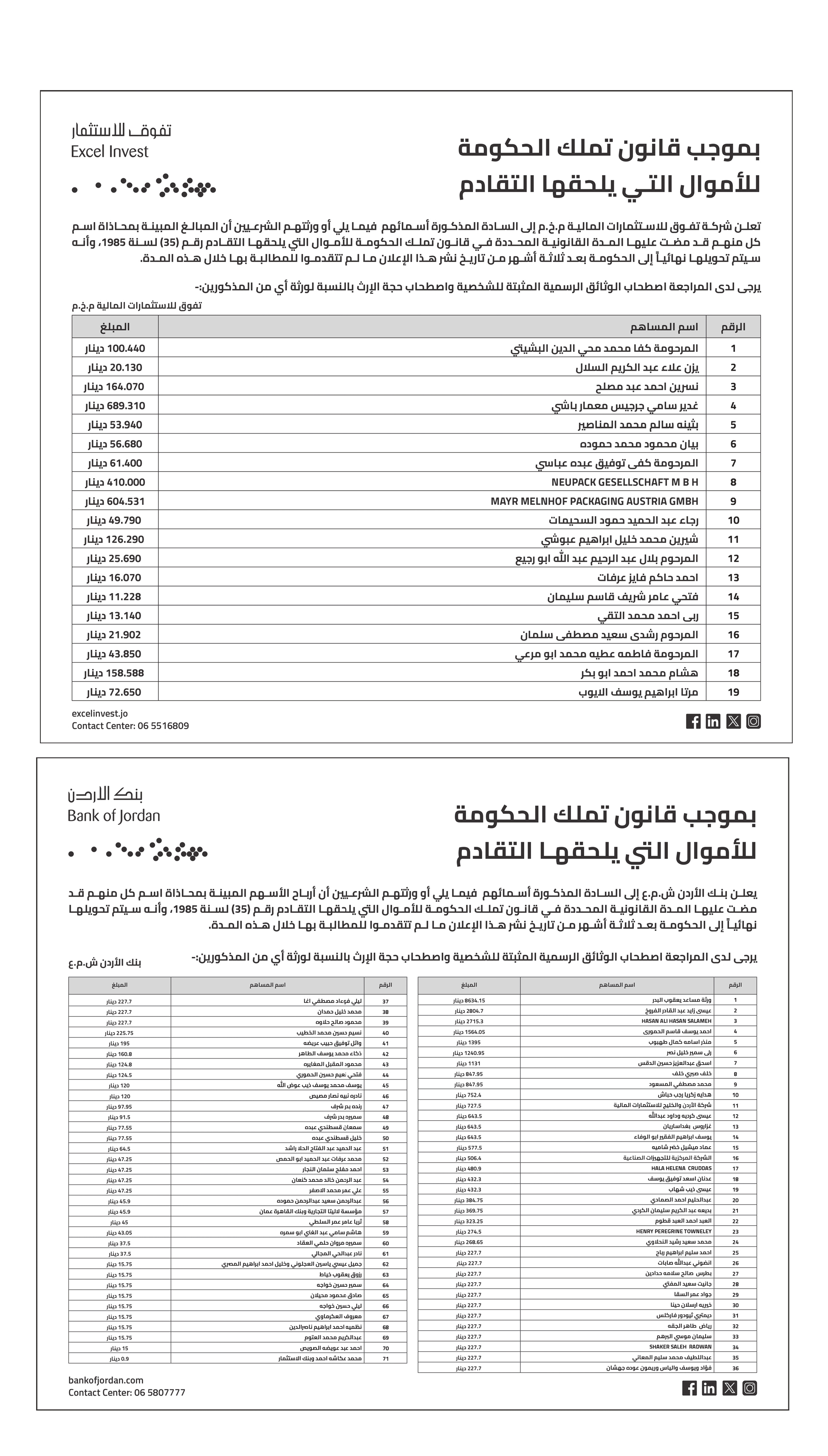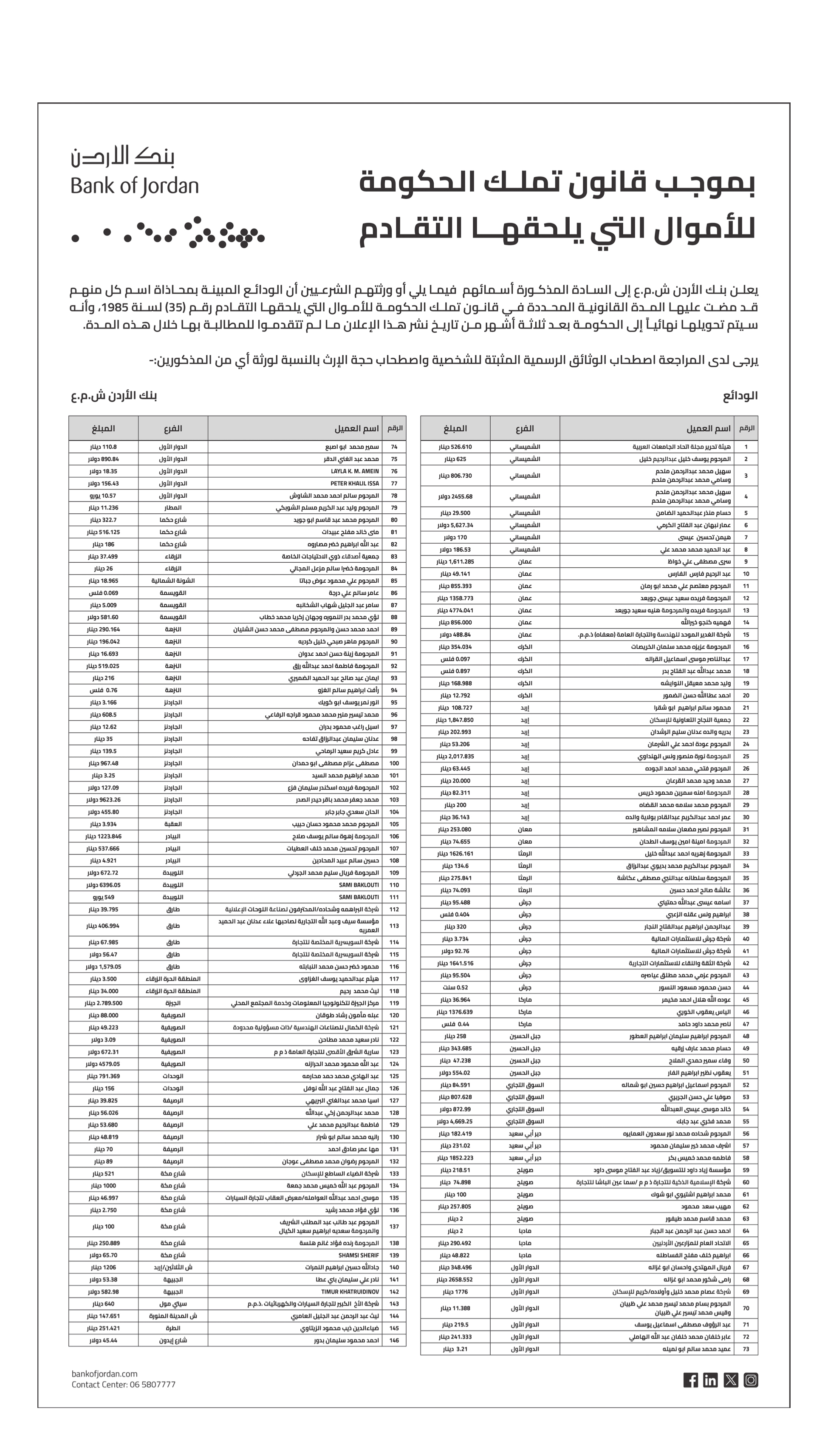 دعا بنك الأردن وشركة تفوق للاستثمارات المالية، اليوم الأربعاء، أصحاب الودائع وأرباح الأسهم أو ورثتهم الشرعيين إلى مراجعة حساباتهم، موضحين أن المبالغ المبينة بمحاذاة اسم كل منهم قد تجاوزت المدة القانونية المحددة في قانون تملك الحكومة للأموال التي يلحقها التقادم.