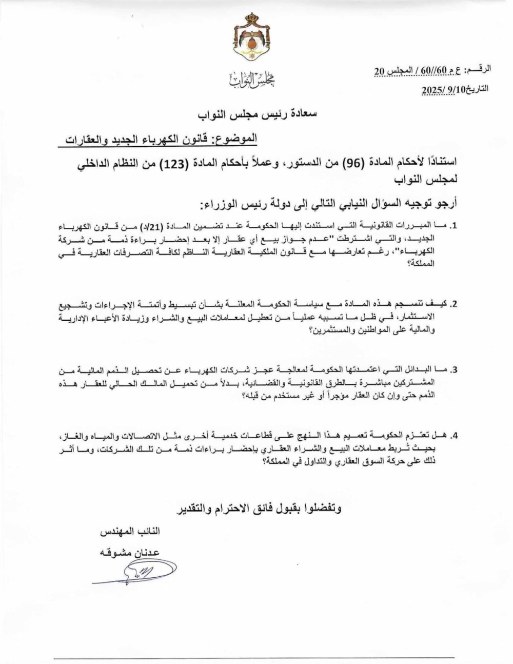 وجه النائب عدنان مشوقة، أسئلة نيابية للحكومة حول قانون الكهرباء الجديد ووضع إشارة رهن على العقار المخالف.