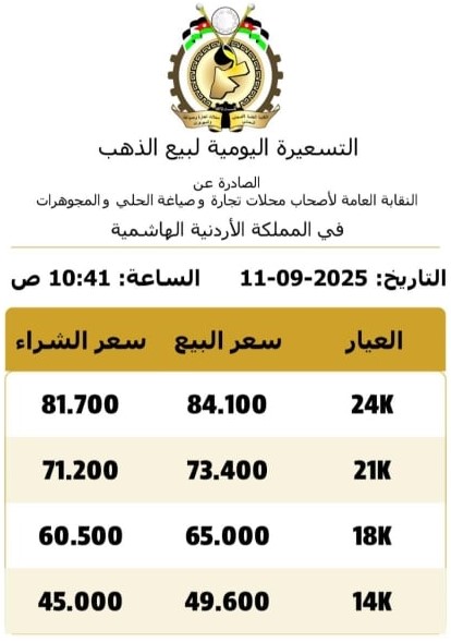 سجلت أسعار الذهب في السوق الأردني، الخميس، انخفاضًا بحوالي 40 قرشًا للغرام الواحد، وفق التسعيرة الرسمية الصادرة عن النقابة العامة لأصحاب محلات تجارة وصياغة الحلي والمجوهرات.