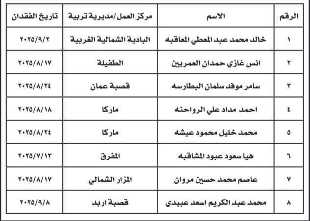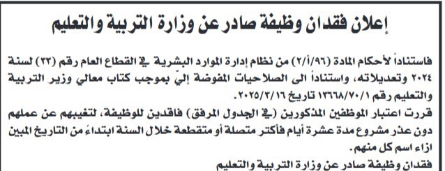 أصدرت وزارة التربية والتعليم، اليوم الاثنين، قراراً باعتبار عدد من الموظفين فاقدين لوظائفهم، بعد تغيّبهم عن العمل لمدة عشرة أيام فأكثر، سواء بشكل متصل أو متقطع، خلال السنة، ودون عذر مشروع.