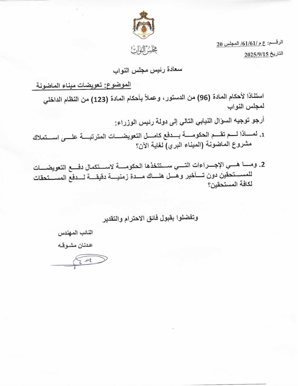 وجه النائب المهندس عدنان مشوقة أسئلة للحكومة بشأن مشروع الماضونة المعروف بالميناء البري، مطالبًا بتوضيح أسباب عدم دفع كامل التعويضات المترتبة على استملاكات المشروع حتى الآن.