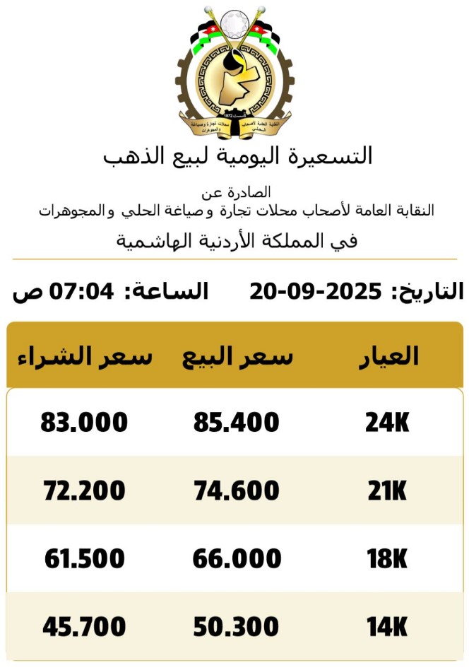 وسجل سعر غرام الذهب عيار 21 الأكثر تداولا بين الأردنيين 74.60 دينار لغايات البيع من محلات الصاغة، مقابل 72.20 دينار للشراء.