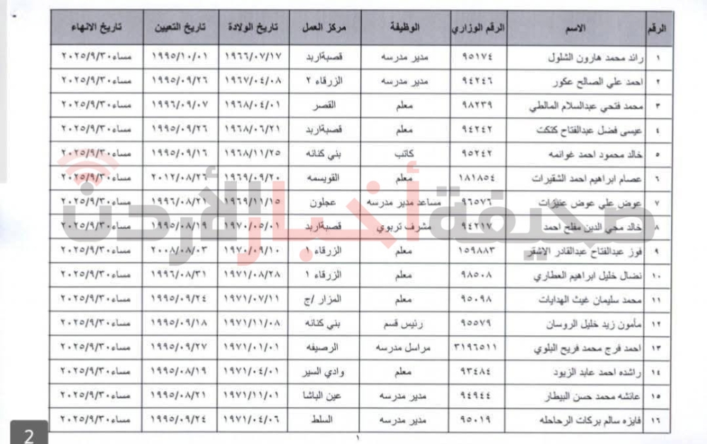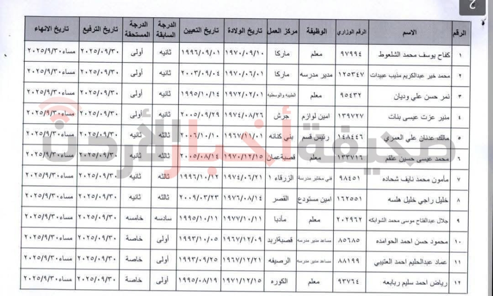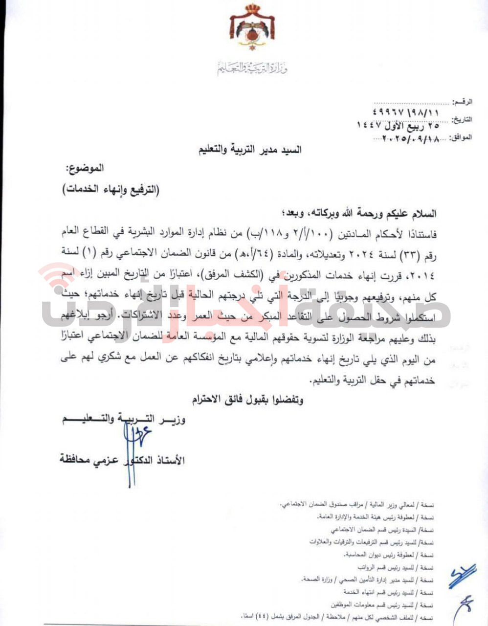 قرر وزير التربية والتعليم، د. عزمي محافظة، ترفيع عدد من الموظفين وإنهاء خدماتهم بعد أن استكملوا شروط الحصول على التقاعد المبكر من حيث العمر وعدد الاشتراكات.