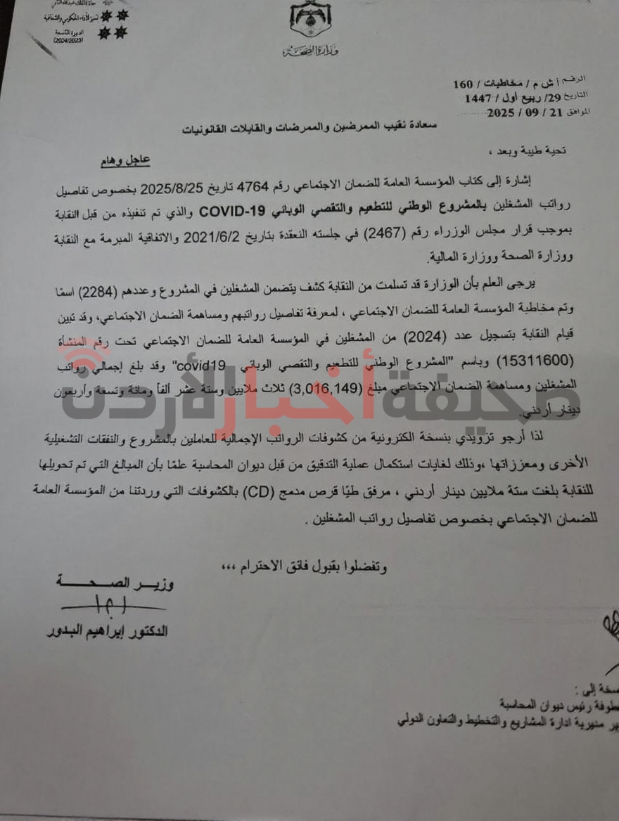 وأكد البدور في كتابه أن وزارة الصحة حولت للنقابة مبالغ وصلت إلى 6 ملايين دينار لتنفيذ المشروع الذي أُطلق عام 2021 بقرار من مجلس الوزراء.