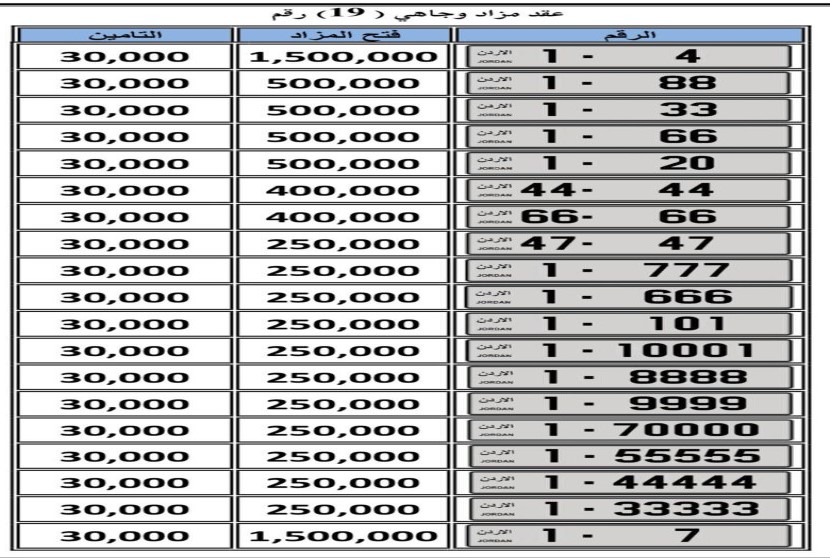 وأشار القرعان إلى أن المشاركة في المزاد ممكنة عبر التسجيل على الموقع الإلكتروني لإدارة الترخيص ودفع التأمين إلكترونيًا، أو من خلال إيداعه في الحساب البنكي المخصص لذلك، موضحًا أن الأسعار ستكون شاملة للضريبة، وأن التأمين يمنح المزاود الحق في المنافسة على جميع الأرقام المعروضة.