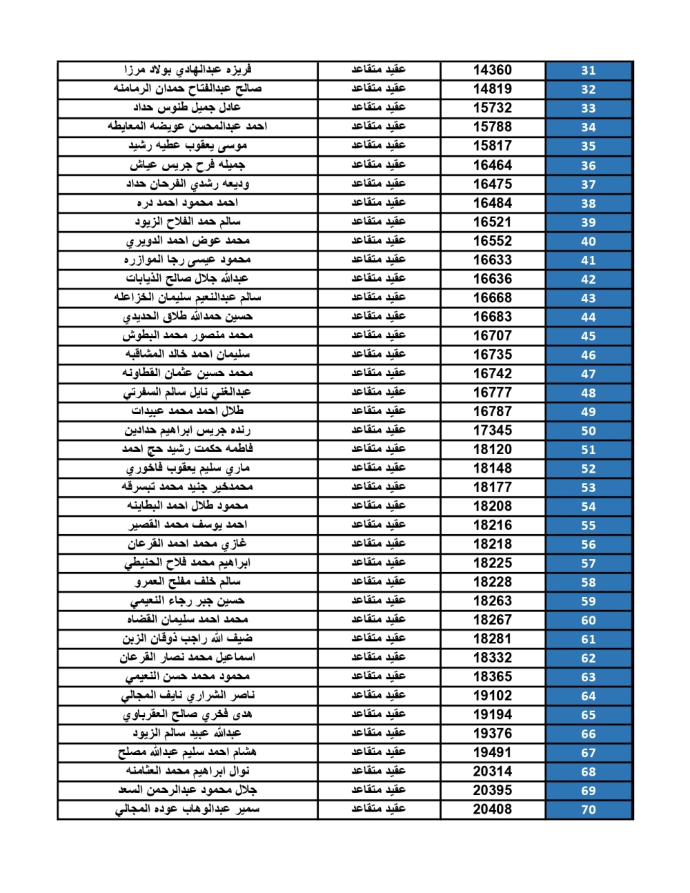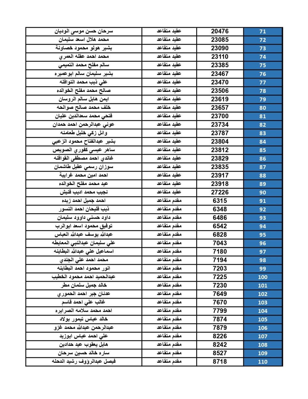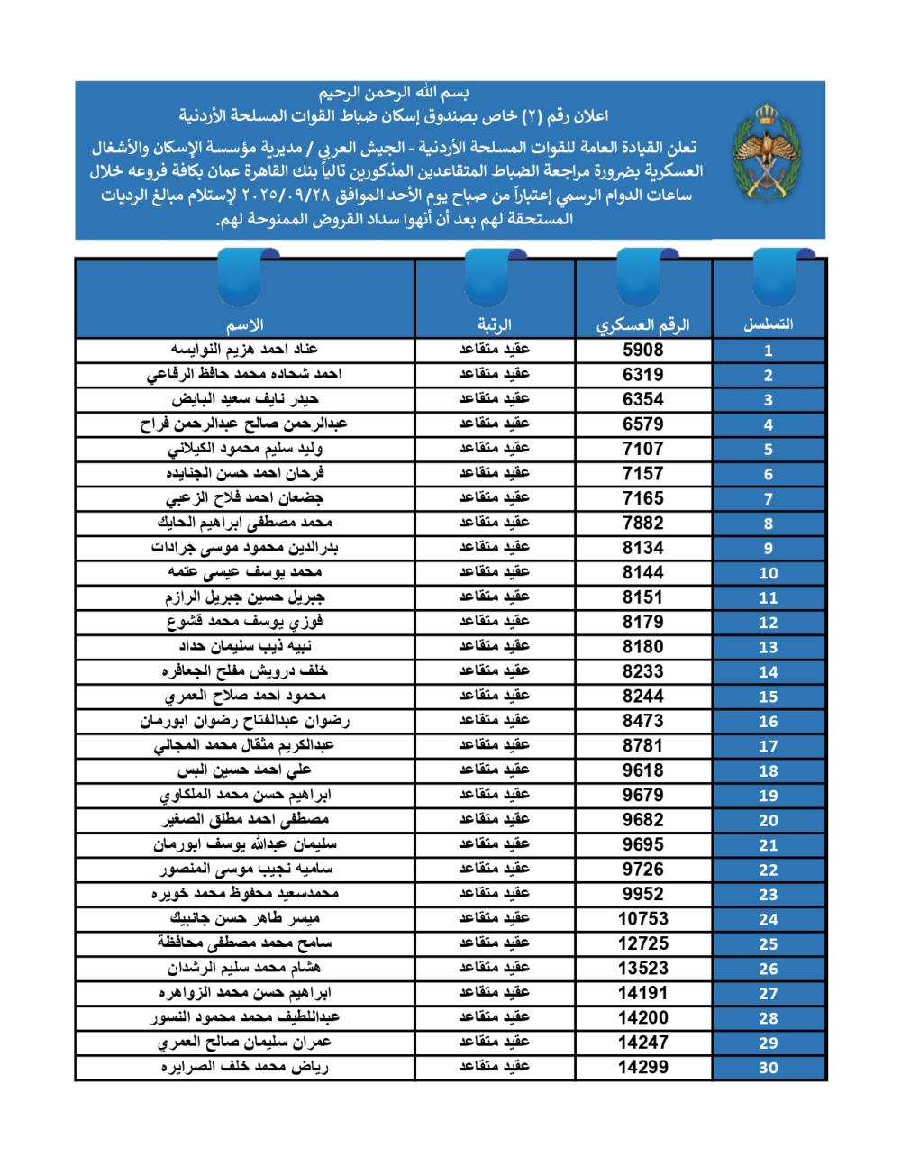 أعلنت القيادة العامة للقوات المسلحة الأردنية – الجيش العربي/ مديرية مؤسسة الإسكان والأشغال العسكرية، عن ضرورة مراجعة الضباط المستفيدين من صندوق إسكان ضباط القوات المسلحة الأردنية، المصنّفين أسماؤهم أدناه، بنك القاهرة عمان بكافة فروعه خلال ساعات الدوام الرسمي، اعتباراً من يوم الأحد 28/09/2025، لاستلام مبالغ الرديات المستحقة بعد الانتهاء من سداد القروض الممنوحة لهم.