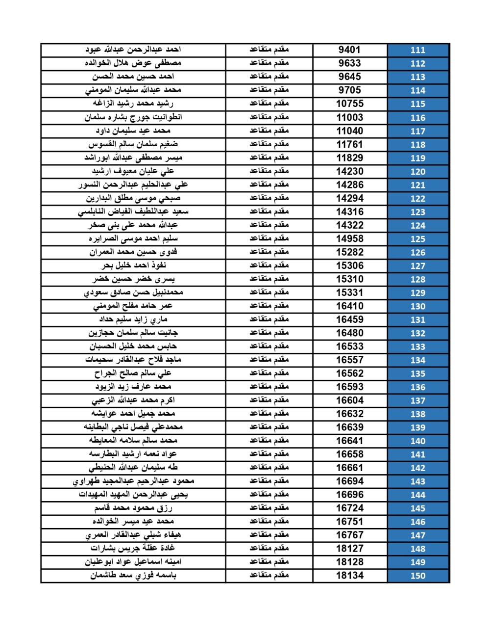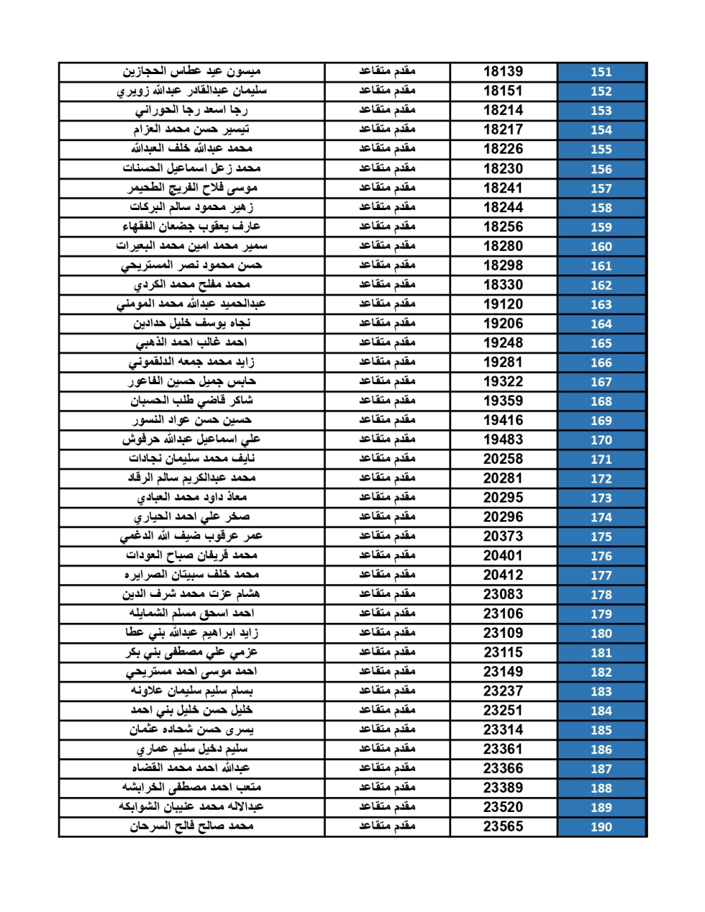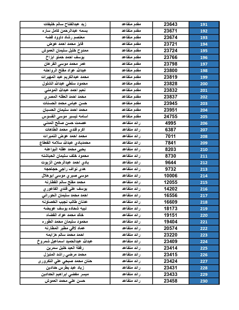 أعلنت القيادة العامة للقوات المسلحة الأردنية – الجيش العربي/ مديرية مؤسسة الإسكان والأشغال العسكرية، عن ضرورة مراجعة الضباط المستفيدين من صندوق إسكان ضباط القوات المسلحة الأردنية، المصنّفين أسماؤهم أدناه، بنك القاهرة عمان بكافة فروعه خلال ساعات الدوام الرسمي، اعتباراً من يوم الأحد 28/09/2025، لاستلام مبالغ الرديات المستحقة بعد الانتهاء من سداد القروض الممنوحة لهم.