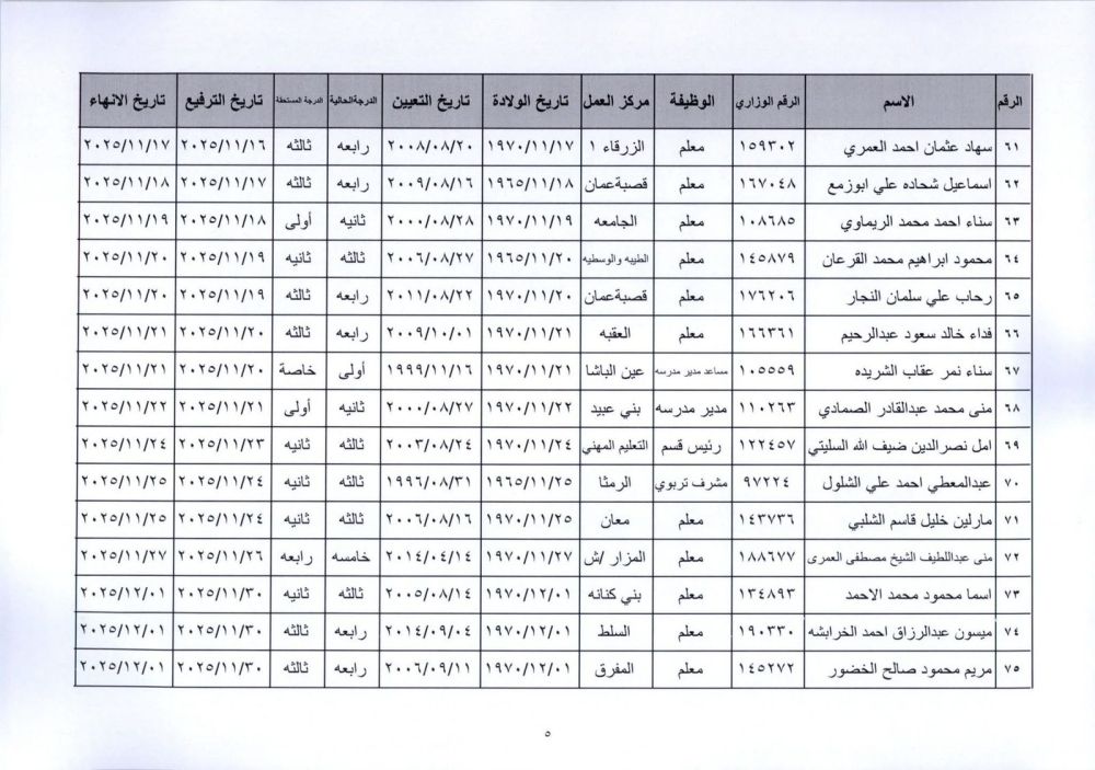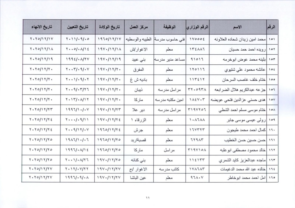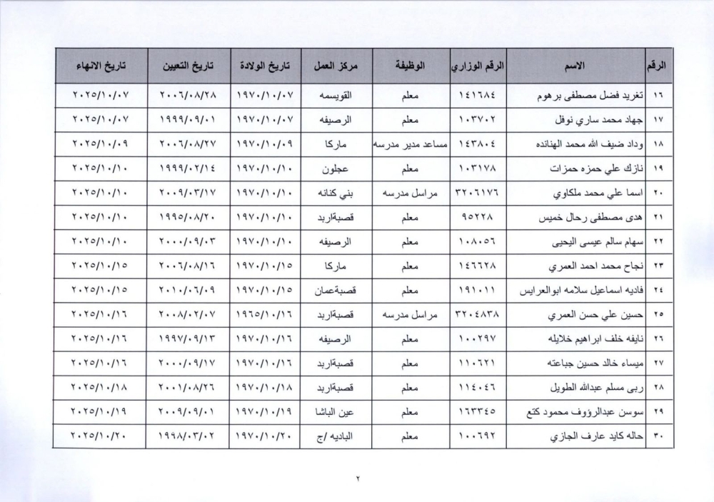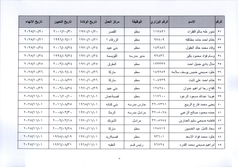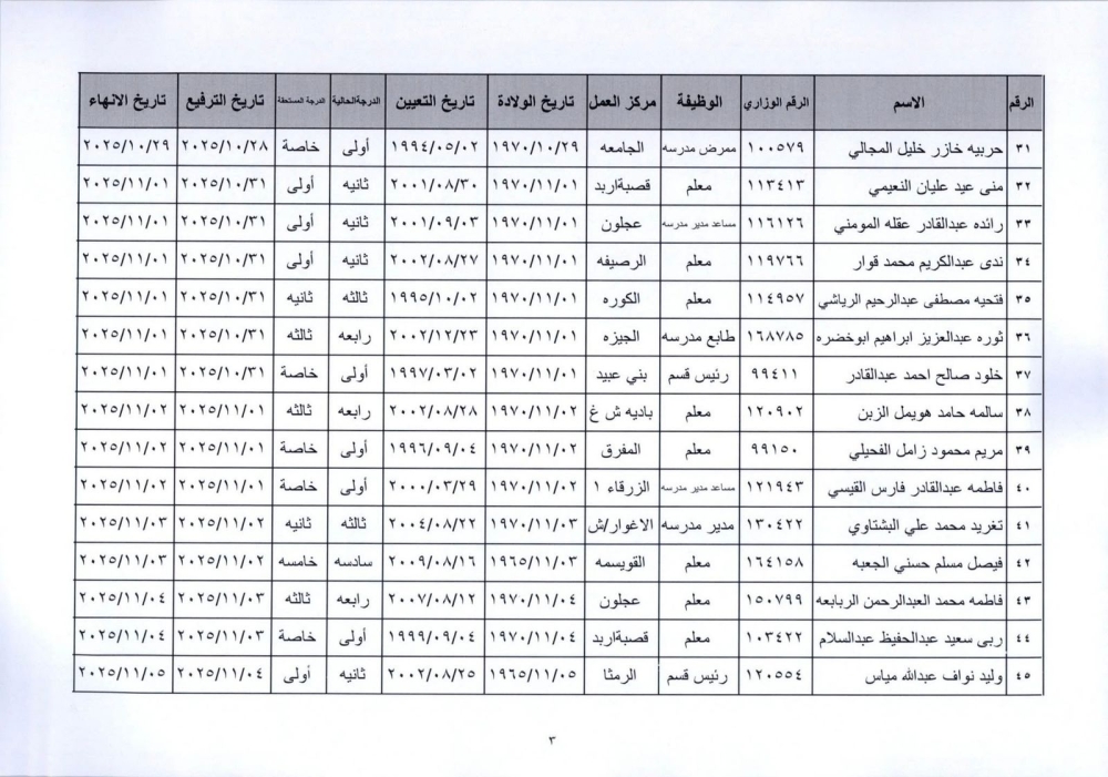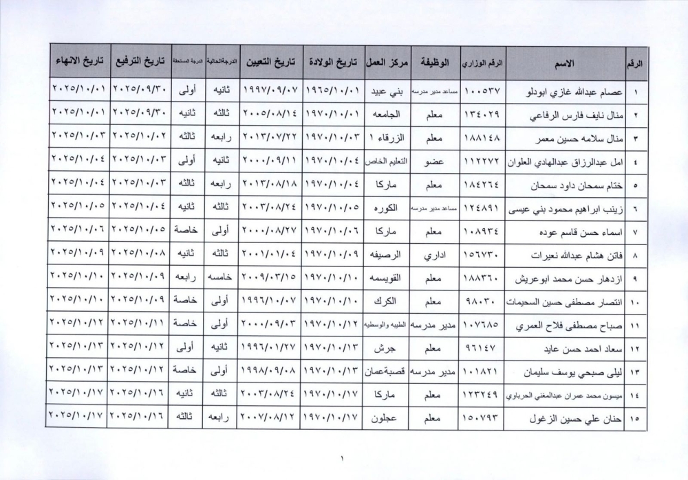 قرر وزير التربية والتعليم إنهاء خدمات المذكورين في الكشف المرفق لبلوغهم السن القانونية، اعتبارا من التاريخ المبين إزاء اسم كل منهم وترفيعهم وجوبيًا من الدرجة الحالية إلى الدرجة الأعلى قبل تاريخ إنهاء خدماتهم.