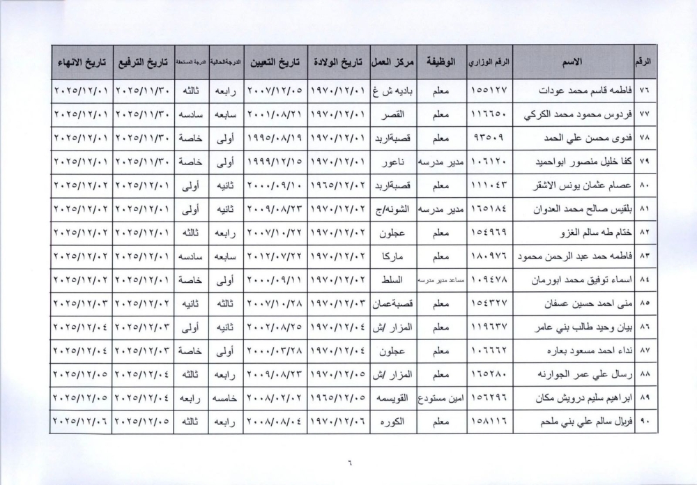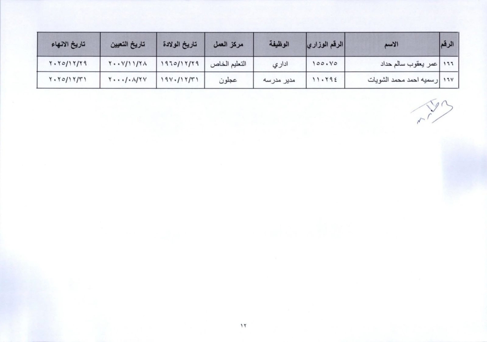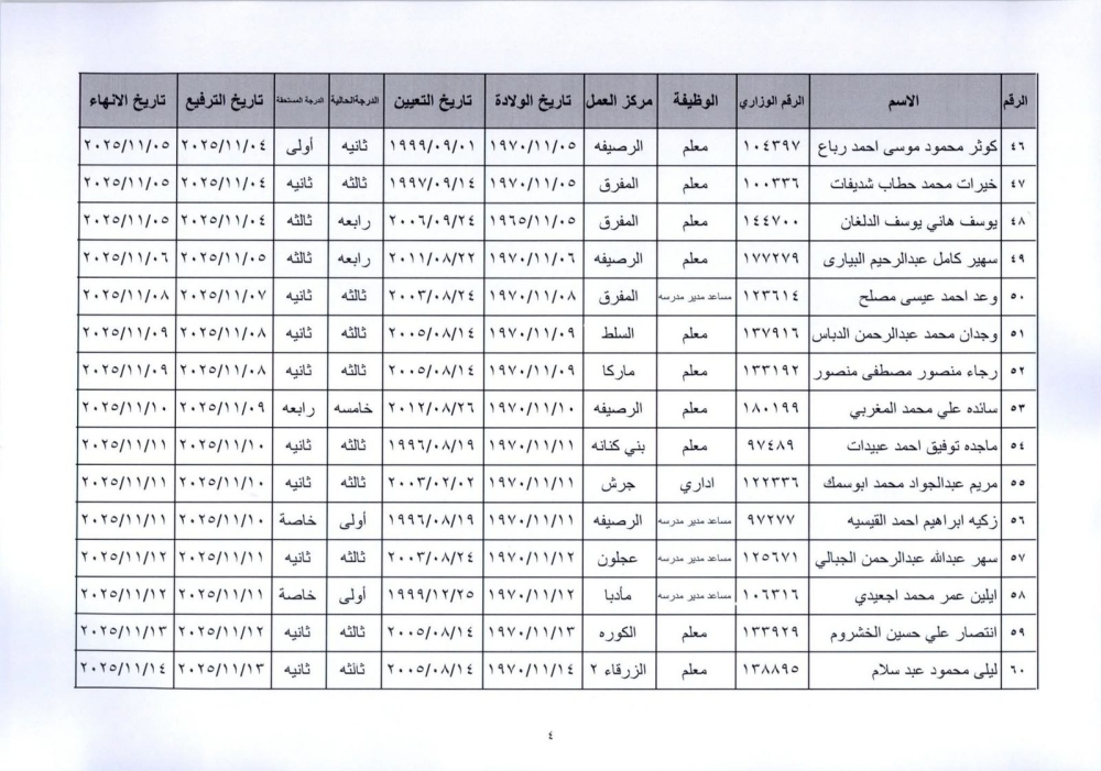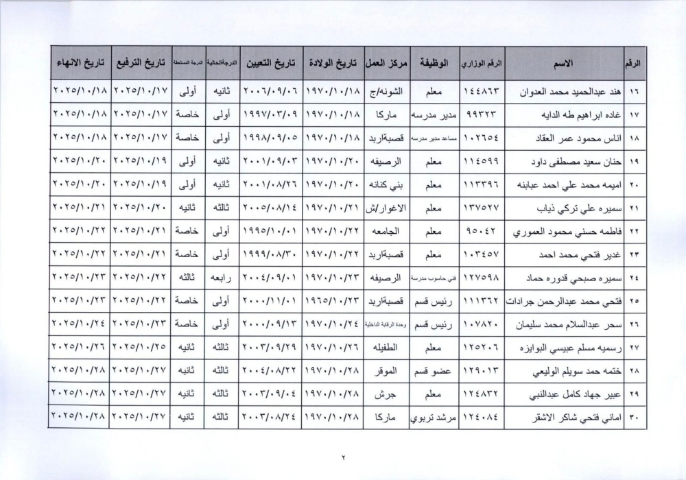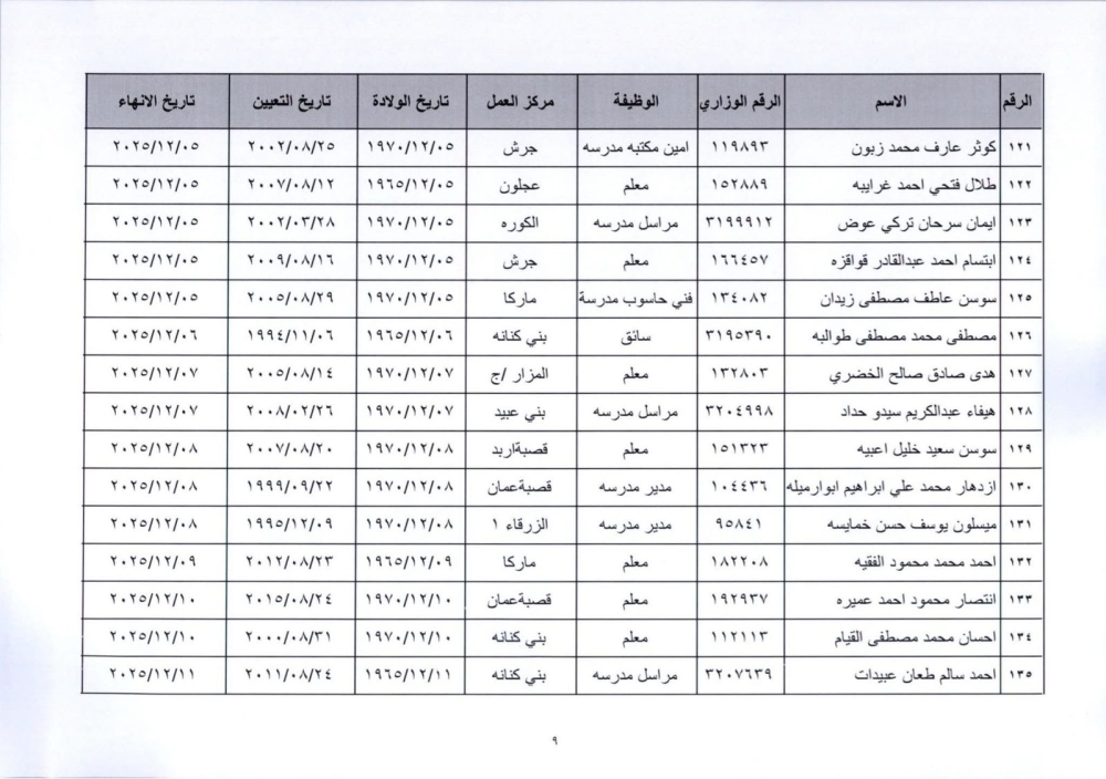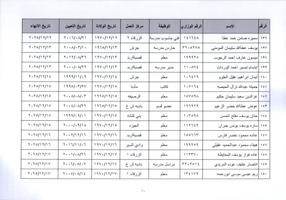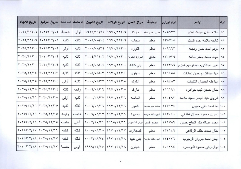 قرر وزير التربية والتعليم إنهاء خدمات المذكورين في الكشف المرفق لبلوغهم السن القانونية، اعتبارا من التاريخ المبين إزاء اسم كل منهم وترفيعهم وجوبيًا من الدرجة الحالية إلى الدرجة الأعلى قبل تاريخ إنهاء خدماتهم.