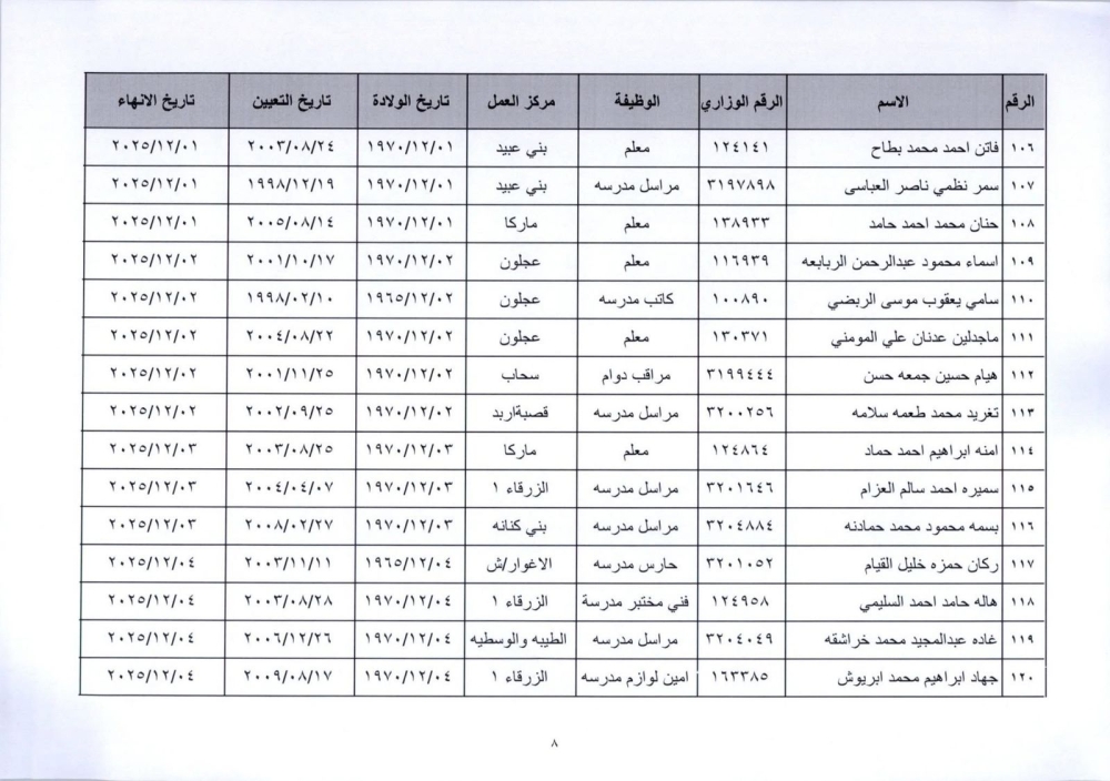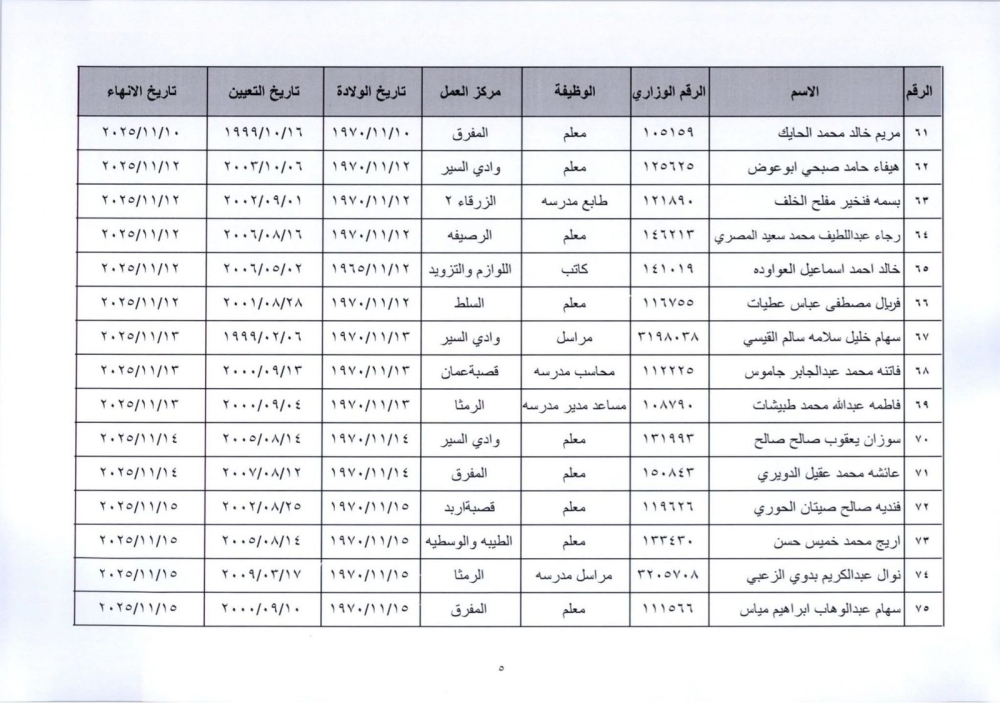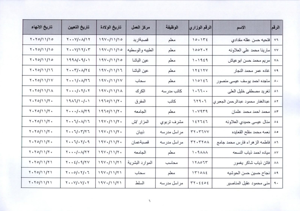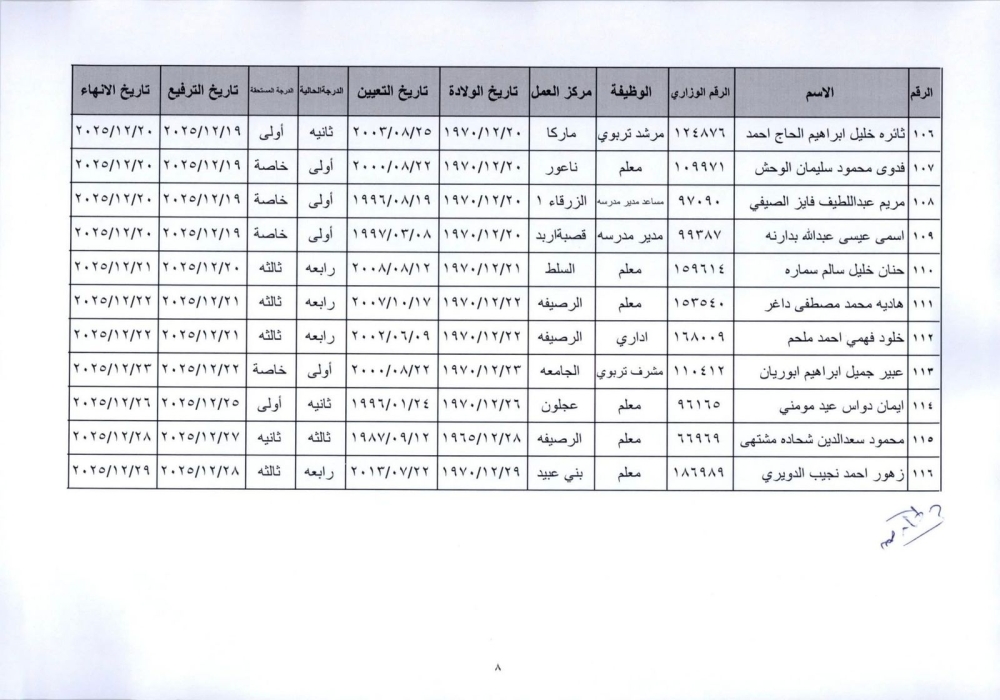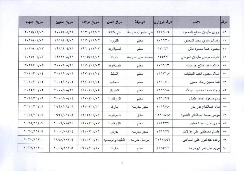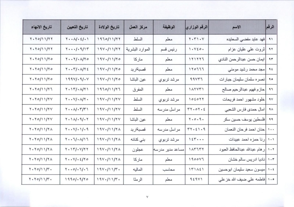 قرر وزير التربية والتعليم إنهاء خدمات المذكورين في الكشف المرفق لبلوغهم السن القانونية، اعتبارا من التاريخ المبين إزاء اسم كل منهم وترفيعهم وجوبيًا من الدرجة الحالية إلى الدرجة الأعلى قبل تاريخ إنهاء خدماتهم.