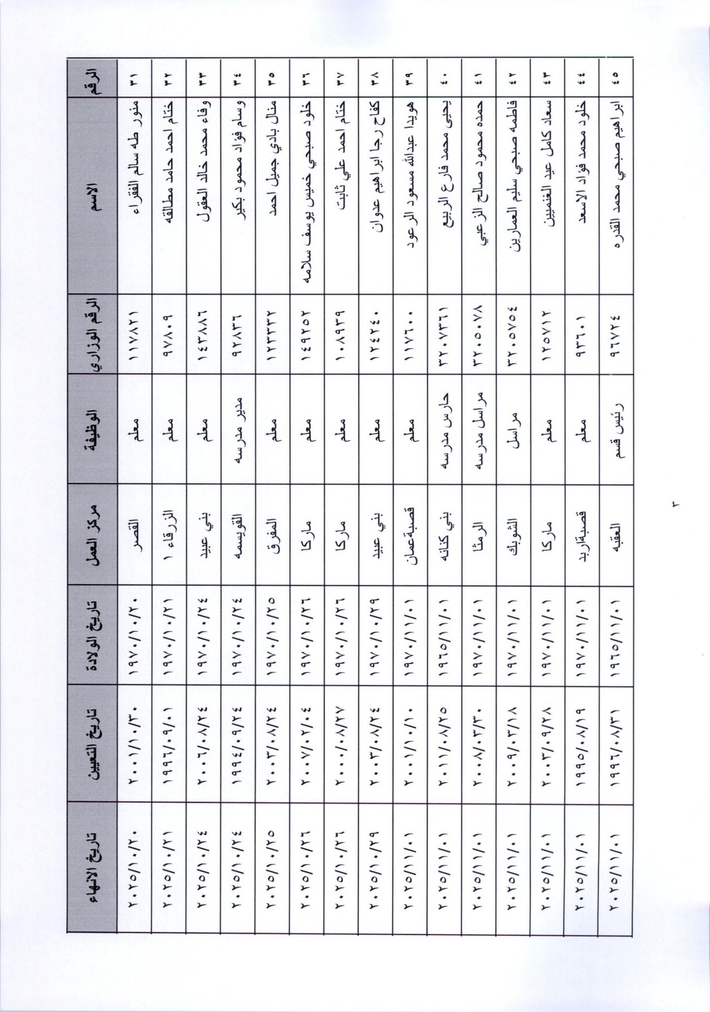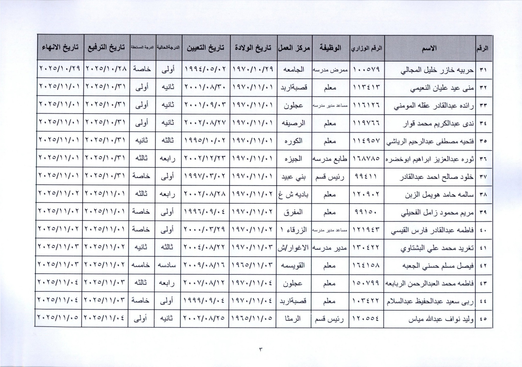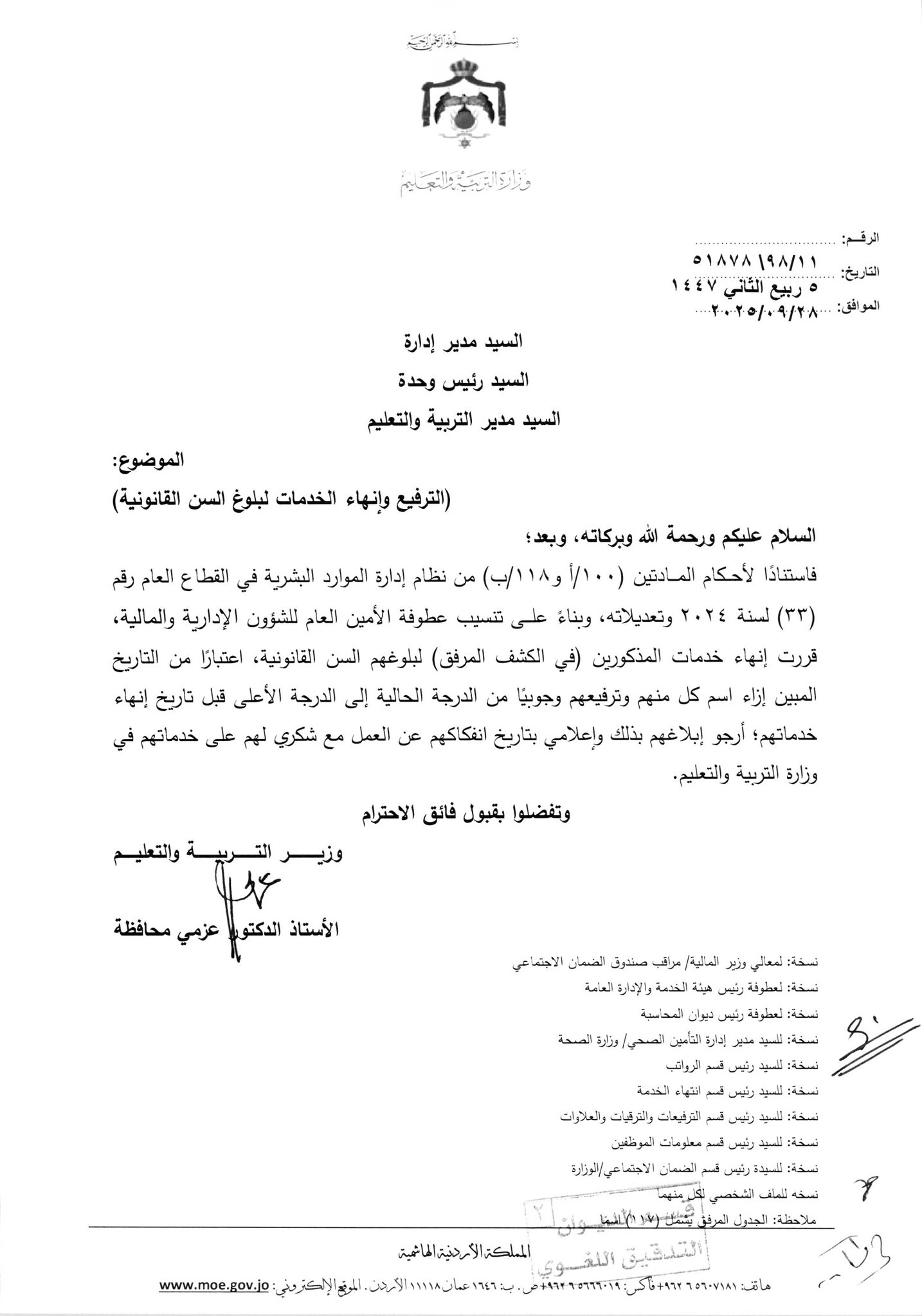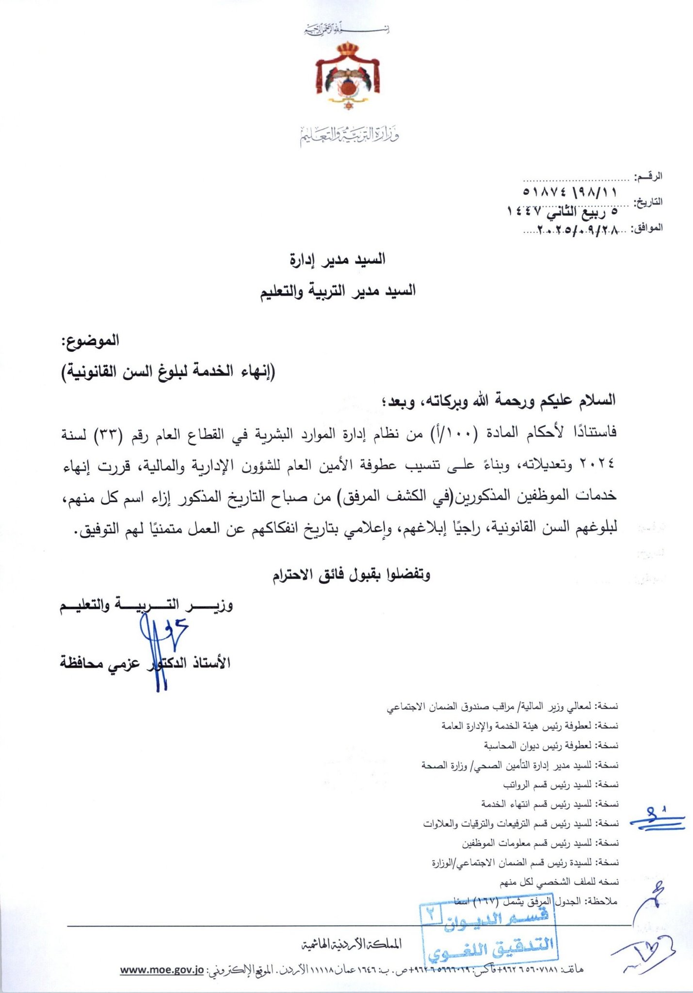 قرر وزير التربية والتعليم، إنهاء خدمات المئات من موظفي الوزارة لبلوغهم السن القانونية، اعتبارا من التاريخ المبين إزاء اسم كل منهم.