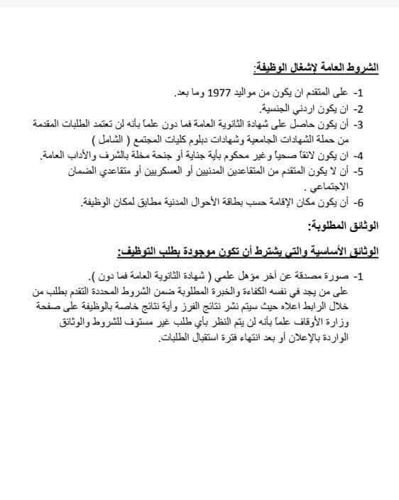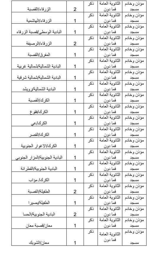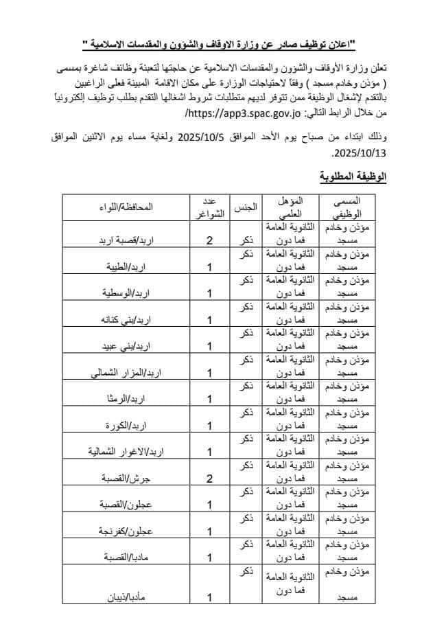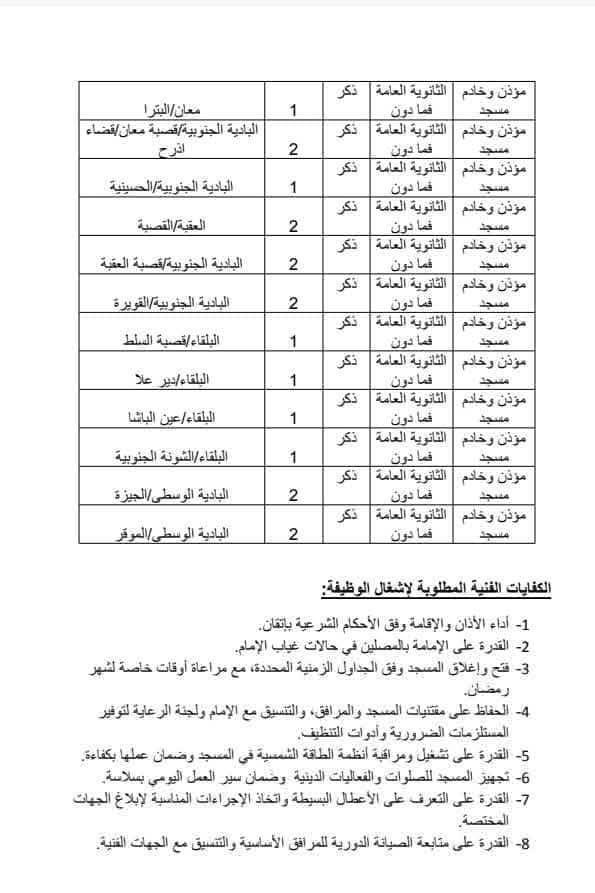 أعلنت وزارة الأوقاف والشؤون والمقدسات الإسلامية عن توفر شواغر وظيفية بمسمى مؤذن وخادم مسجد، وذلك ضمن احتياجاتها في مختلف المحافظات وحسب مكان الإقامة.