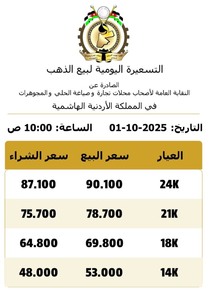 واصلت أسعار الذهب في السوق المحلية ارتفاعها القياسي صباح الأربعاء، لتصل إلى أعلى مستوى لها في تاريخ الأردن.