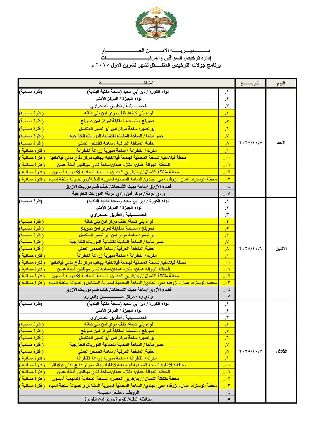 أعلنت إدارة ترخيص السواقين والمركبات عن مواعيد العمل بجولات الترخيص المتنقل والمسائي ضمن المبادرة الابتكارية (بنوصلك) خلال شهر تشرين الأول لعام 2025 في عدد من مناطق المملكة.