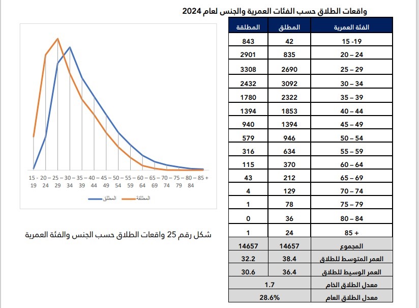 كما أظهر التحليل الإحصائي أن الإناث يُقدمن على الطلاق في سن أصغر من الذكور، حيث تتركز أعلى النسب بين السيدات في أوائل ومنتصف العشرينات، بينما تُسجَّل النسب الأعلى بين الرجال في أواخر العشرينات وأوائل الثلاثينات.
