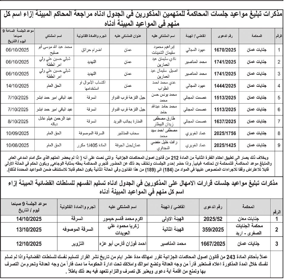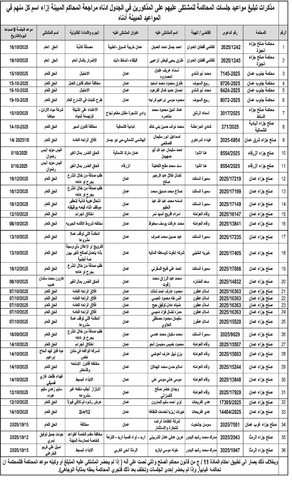 أصدرت محاكم أردنية، اليوم الاثنين، مذكرات تبليغ بحق مجموعة من المشتكى عليهم والمتهمين والأظناء، تضمنّت تحديد مواعيد جلسات محاكمتهم إضافة إلى قرارات إمهال.