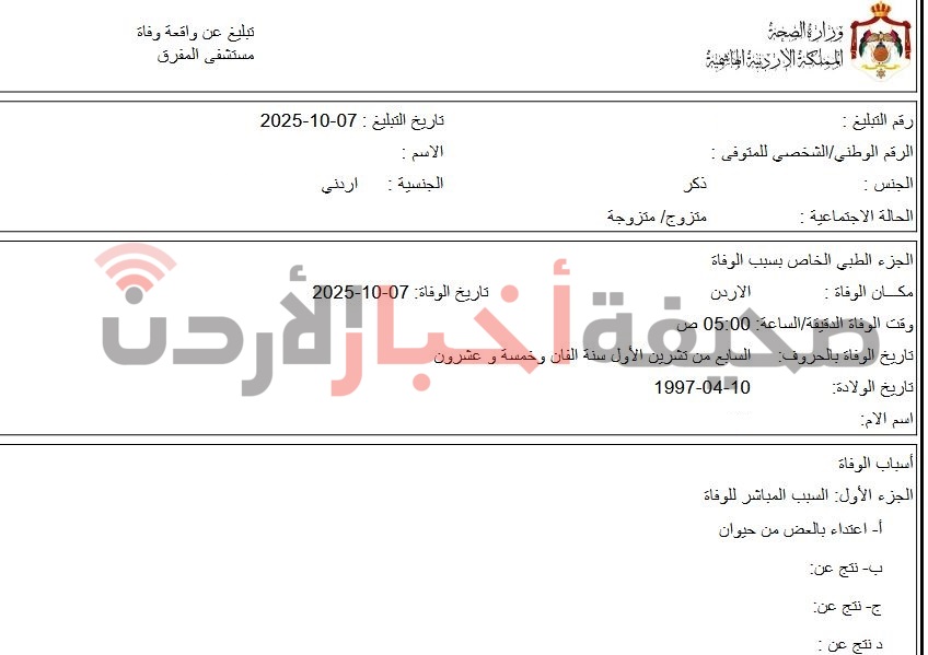 وأفاد تقرير المستشفى، الذي حصلت عليه صحيفة أخبار الأردن الإلكترونية، بأن سبب الوفاة كان "اعتداء بالعض من حيوان".