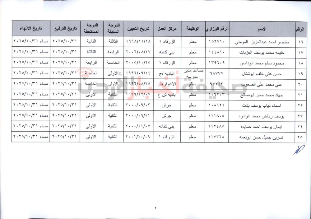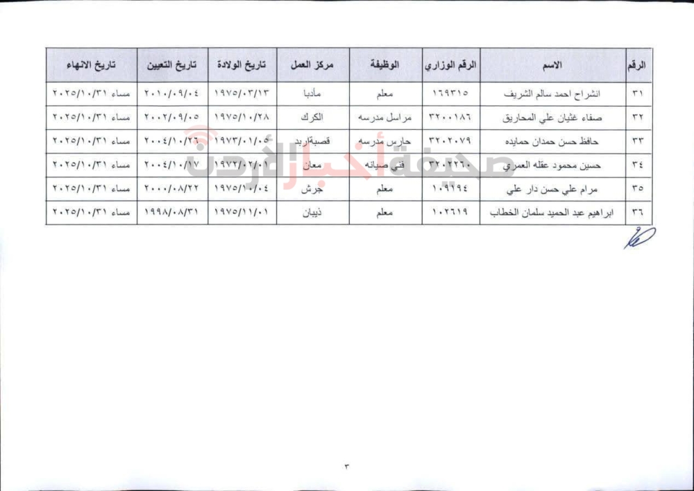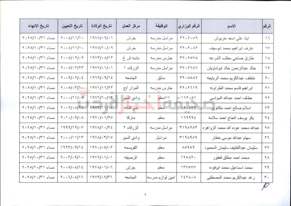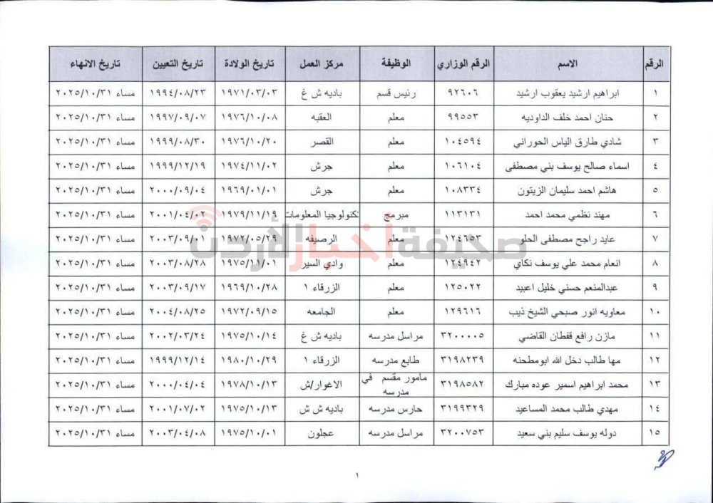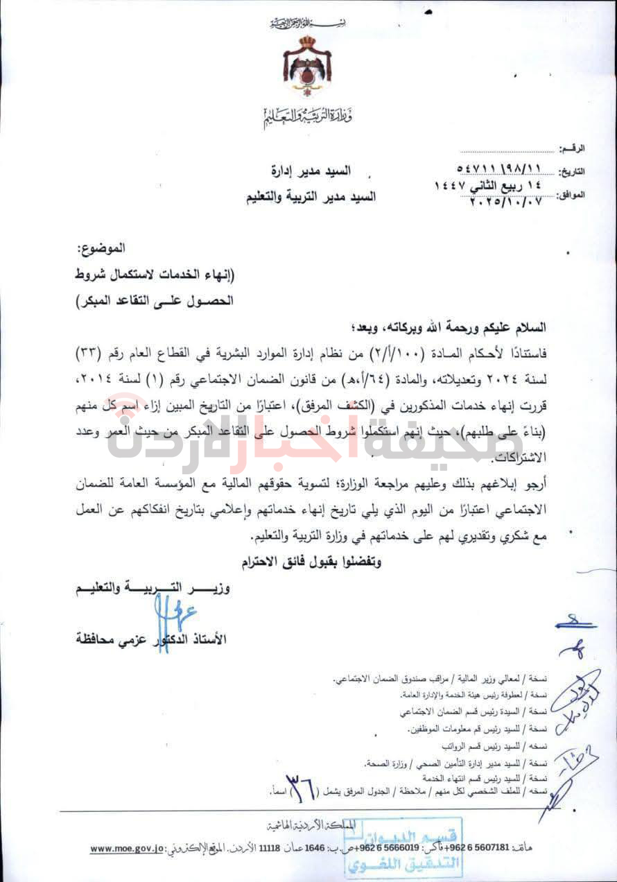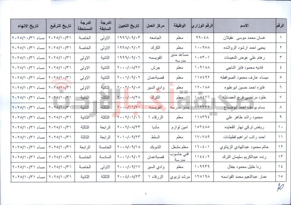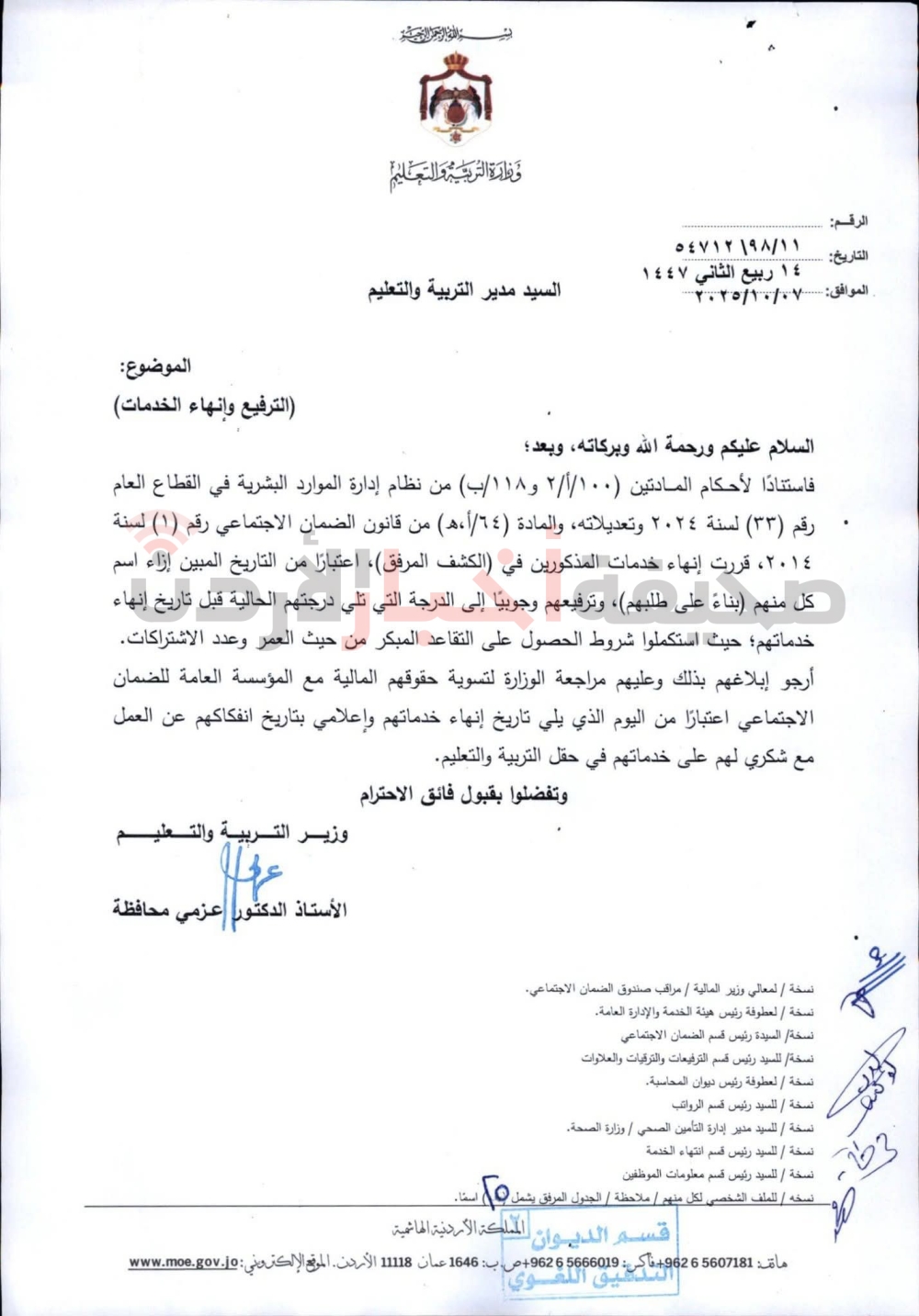 قرر وزير التربية والتعليم إنهاء خدمات المذكورين في الكشوفات المرفقة لبلوغهم السن القانونية، اعتبارا من التاريخ المبين إزاء اسم كل منهم وترفيعهم وجوبيًا من الدرجة الحالية إلى الدرجة الأعلى قبل تاريخ إنهاء خدماتهم.