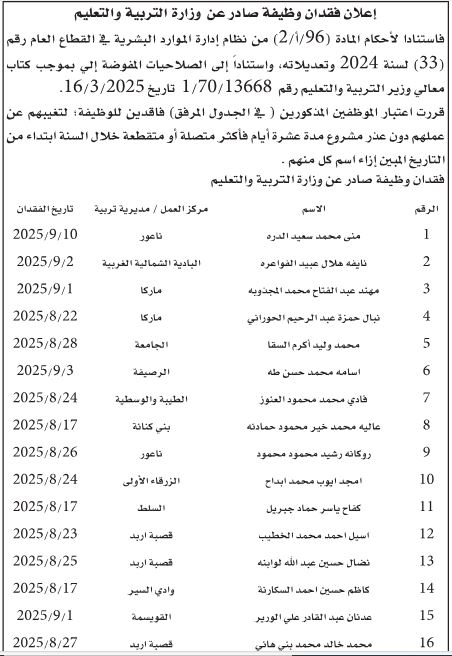 أعلنت وزارة التربية والتعليم، اليوم الاثنين، عن اعتبار مجموعة من المعلمين والموظفين فاقدين لوظائفهم، نظراً لتغيبهم عن عملهم دون عذر مشروع لمدة 10 أيام أو أكثر خلال العام الجاري.