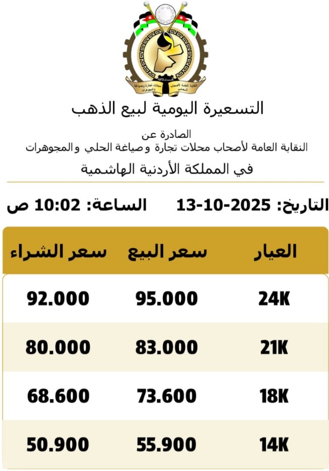 وبحسب النشرة اليومية الصادرة عن النقابة العامة لأصحاب محلات تجارة وصياغة الحلي والمجوهرات، ارتفع سعر الغرام الواحد للذهب عيارات 24 و18 و14 إلى 95 دينارا و73.6 دينار و55.9 دينار على التوالي، لغايات البيع لدى المحلات.
