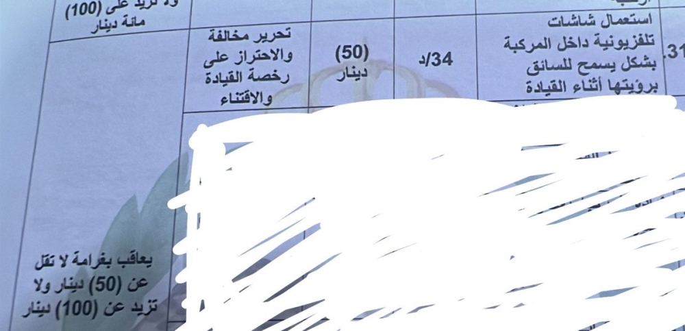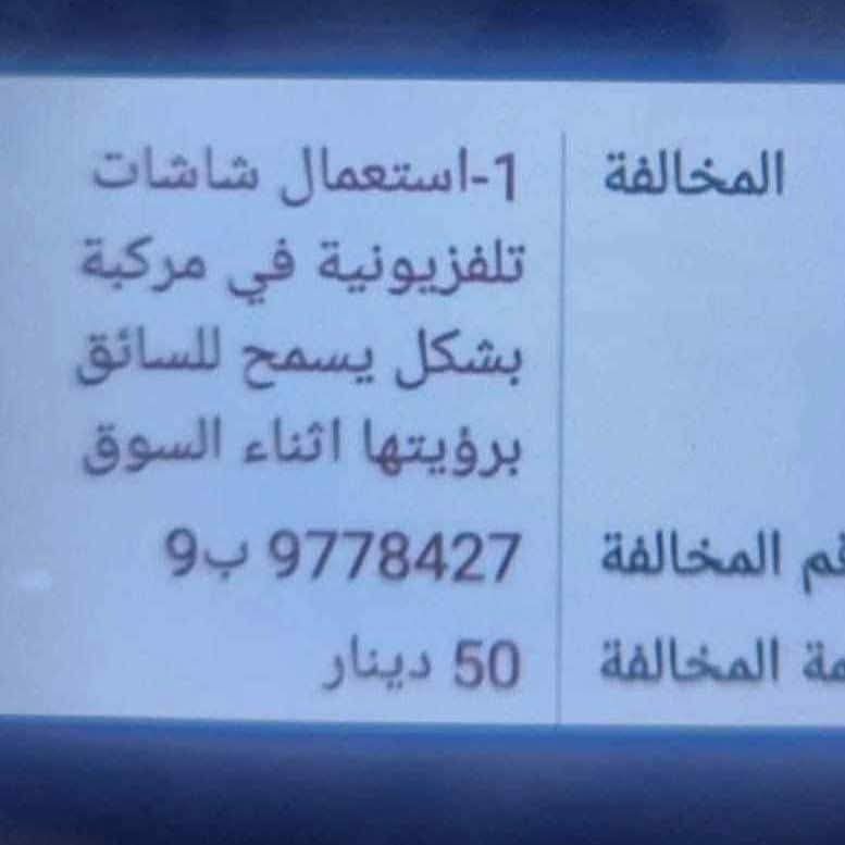 أثارت صورة مخالفة مرورية متداولة عبر مواقع التواصل الاجتماعي جدلا واسعا، بعد أن أظهرت فرض غرامة بقيمة 50 دينار على أحد السائقين تحت بند "استعمال شاشة تلفزيونية في المركبة بشكل يمكنه من رؤيتها أثناء القيادة".
