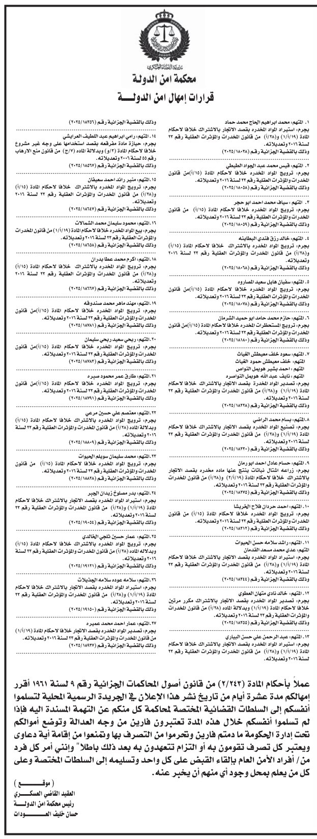وأكد رئيس المحكمة، العقيد القاضي العسكري حسان خليف العودات، أن المتهمين الذين يتخلفون عن تسليم أنفسهم خلال المهلة المحددة سيُعتبرون فارين من وجه العدالة، مشيرا إلى أن الحكومة ستتولى إدارة أموالهم طوال فترة فرارهم، ويحرمون من حق التصرف بها أو إقامة أي دعاوى قانونية أمام المحاكم.