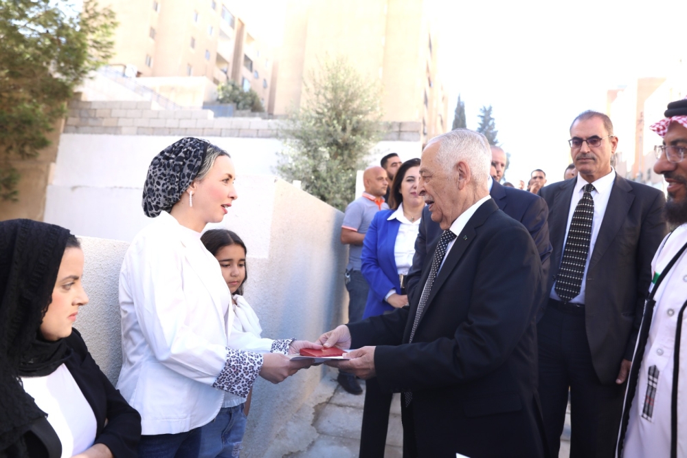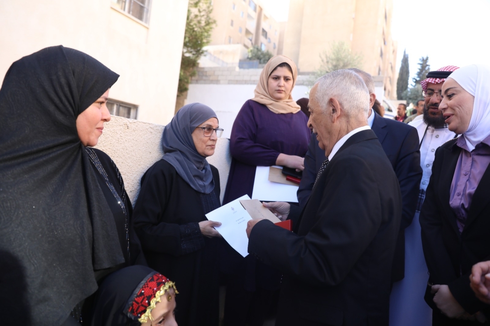 وسلّم رئيس الديوان الملكي الهاشمي يوسف حسن العيسوي، رئيس لجنة متابعة تنفيذ مبادرات جلالة الملك، مفاتيح الشقق السكنية وشهادات الانتفاع للأسر المستفيدة، بحضور وزير الأشغال العامة والإسكان المهندس ماهر أبو السمن، ووزيرة التنمية الاجتماعية وفاء بني مصطفى، ومحافظ العاصمة ياسر العدوان، ومدير عام مؤسسة الإسكان والتطوير الحضري جمانة العطيات، ومدير مكتب الأردن في هيئة الأعمال الخيرية العالمية – الإمارات العربية المتحدة رائد صبري أبو علفة.