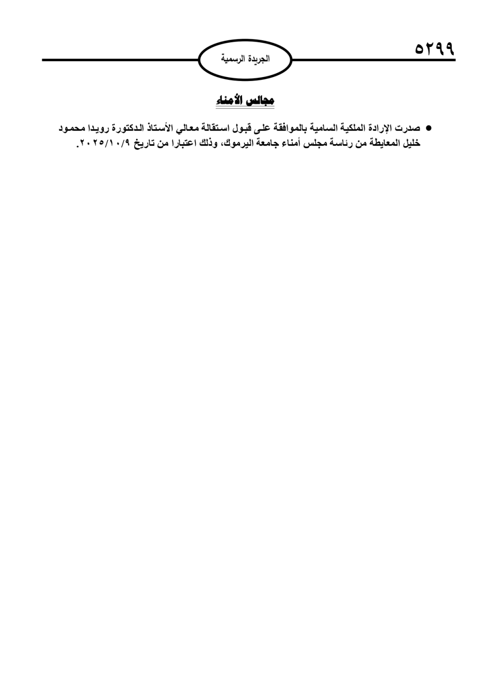 صدرت الإرادة الملكية السامية بالموافقة على قبول استقالة الدكتورة رويدا المعايطة من رئاسة مجلس أمناء جامعة اليرموك، كما صدرت الارادات الملكية السامية بالتالية أسماؤهم: