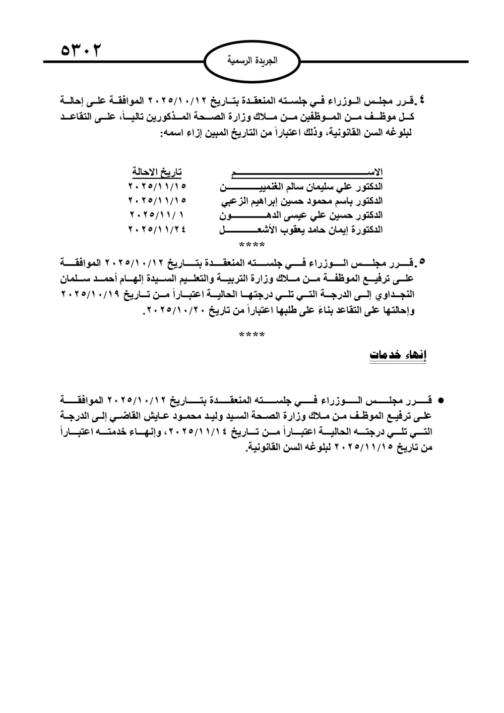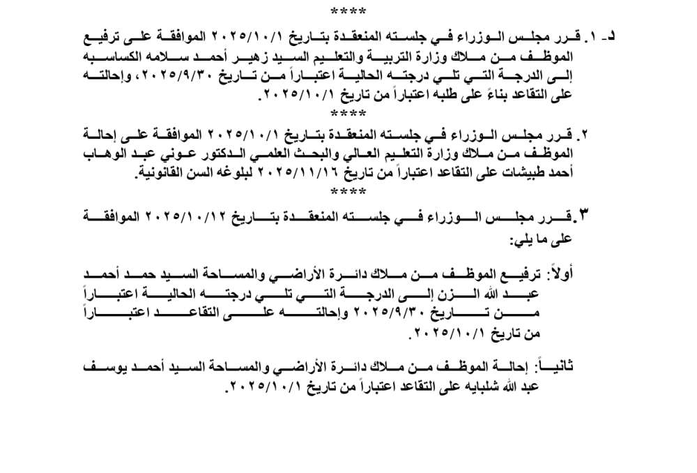 قرر مجلس الوزراء إحالة عدد من موظفي القطاع العام إلى التقاعد، وترفيع عدد منهم، وتاليا تفاصيل القرارات والأسماء: