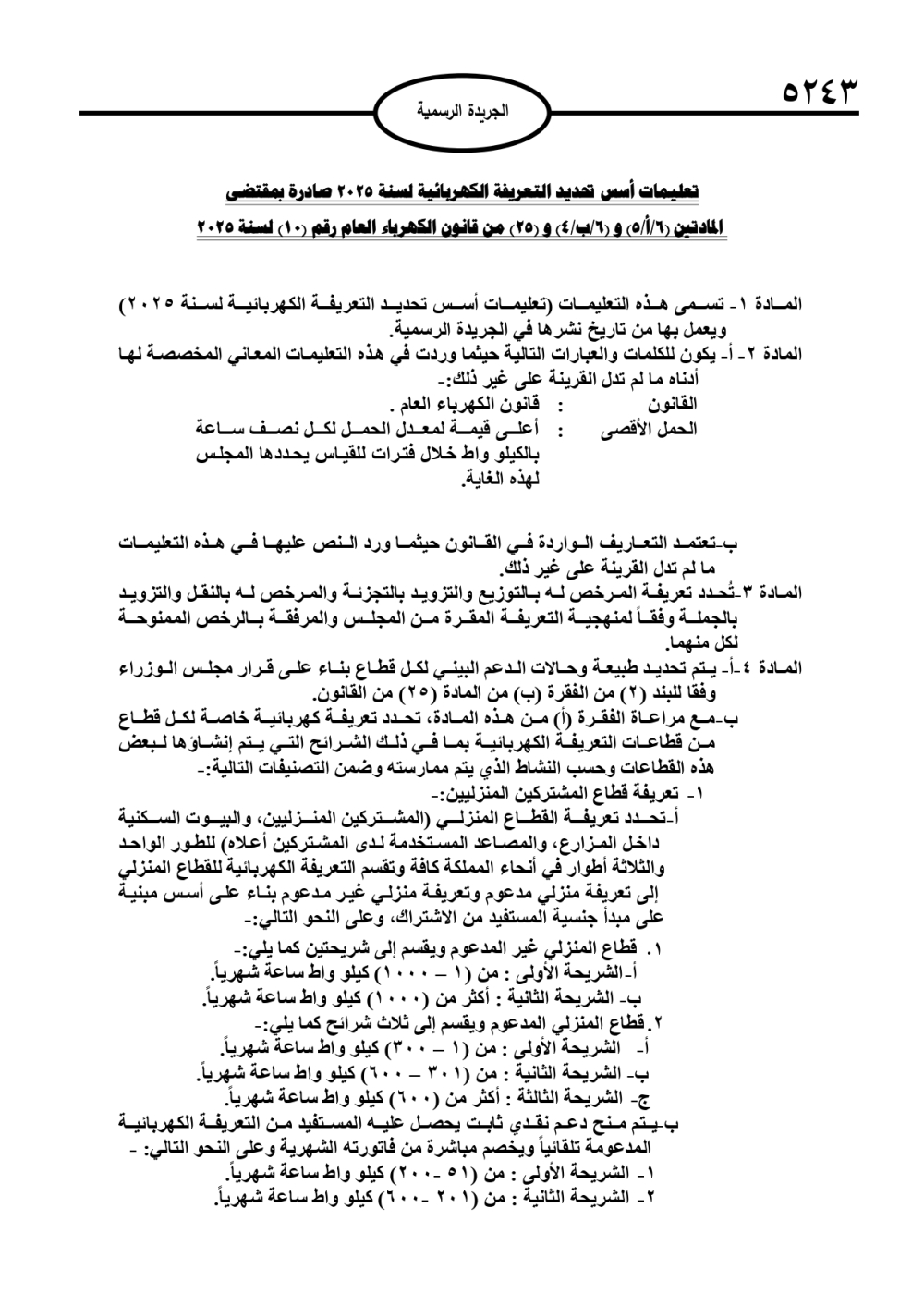 نُشر في الجريدة الرسمية، الخميس، تعليمات أسس تحديد التعريفة الكهربائية لسنة 2025، وتاليا نص التعليمات: