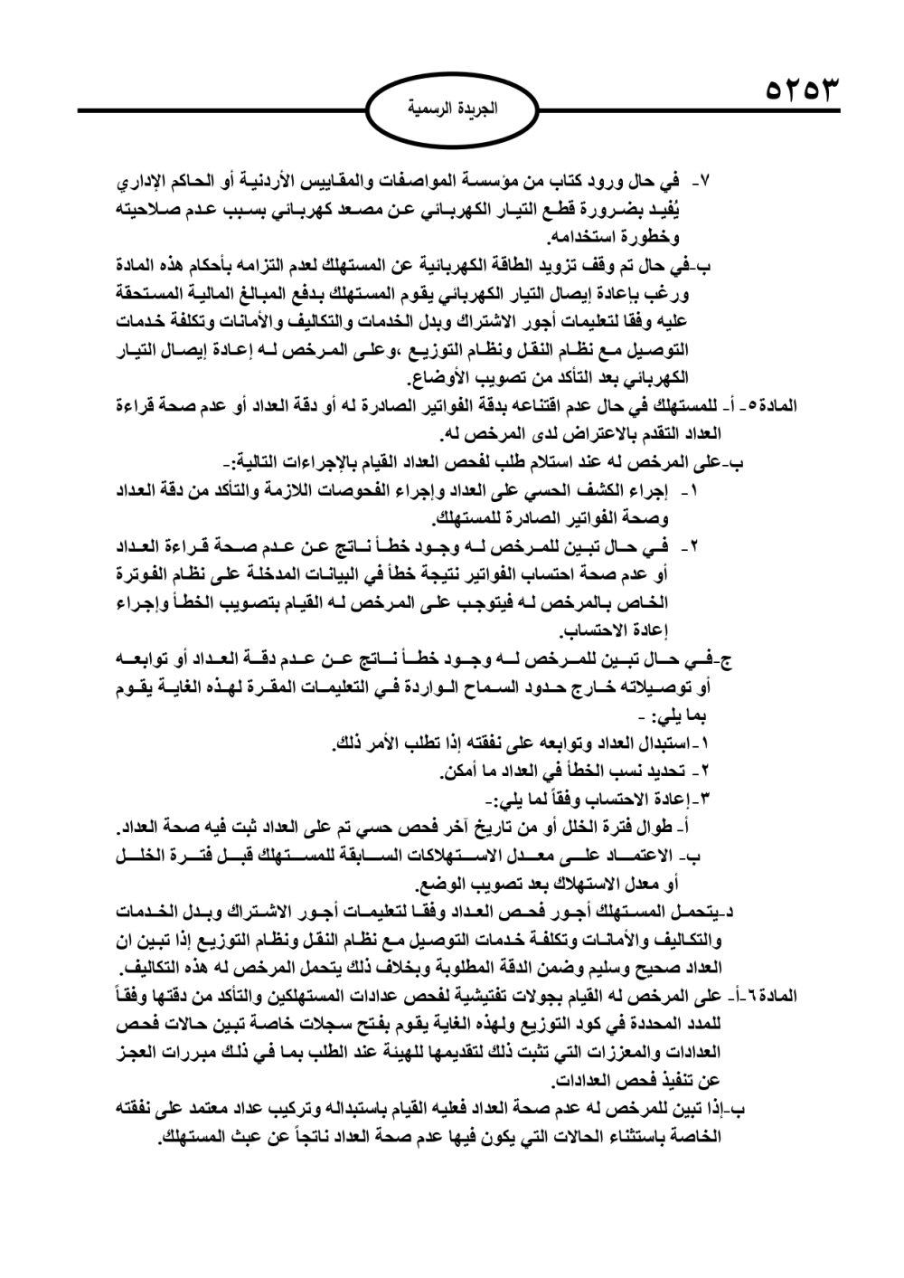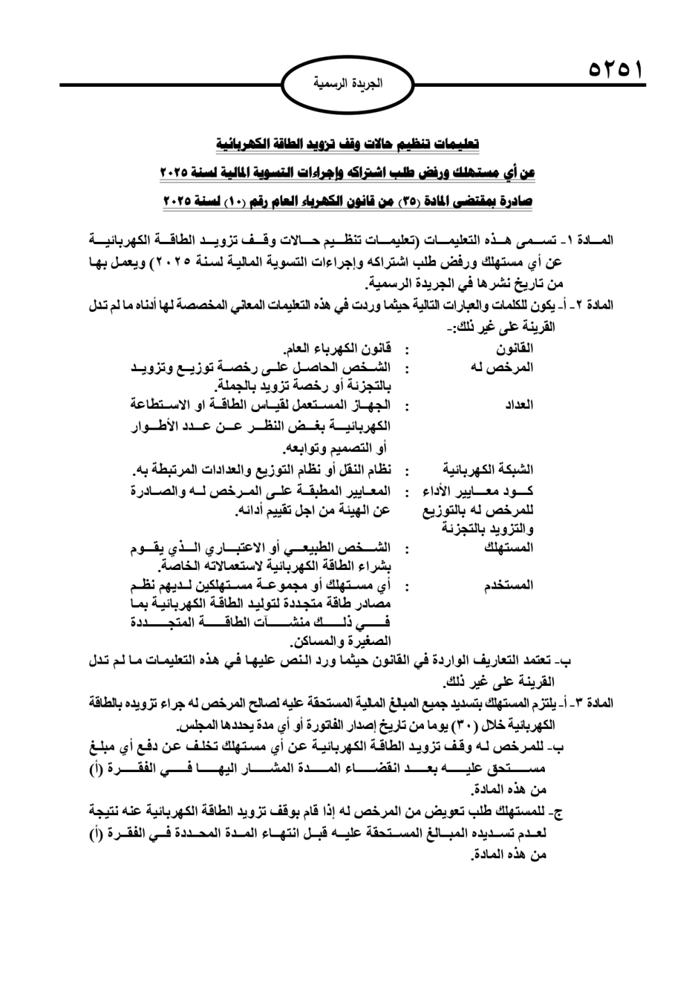 نُشر في الجريدة الرسمية، الخميس، تعليمات تنظيم حالات وقف تزويد الطاقة الكهربائية عن أي مستهلك ورفض طلب اشتراكه وإجراءات التسوية المالية لسنة 2025.وتاليا نص التعليمات: