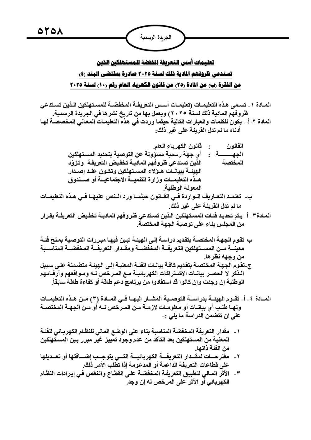 نُشر في الجريدة الرسمية، الخميس، تعليمات أسس التعريفة المخفضة للمستهلكين الذين تستدعي ظروفهم المادية ذلك لسنة 2025.