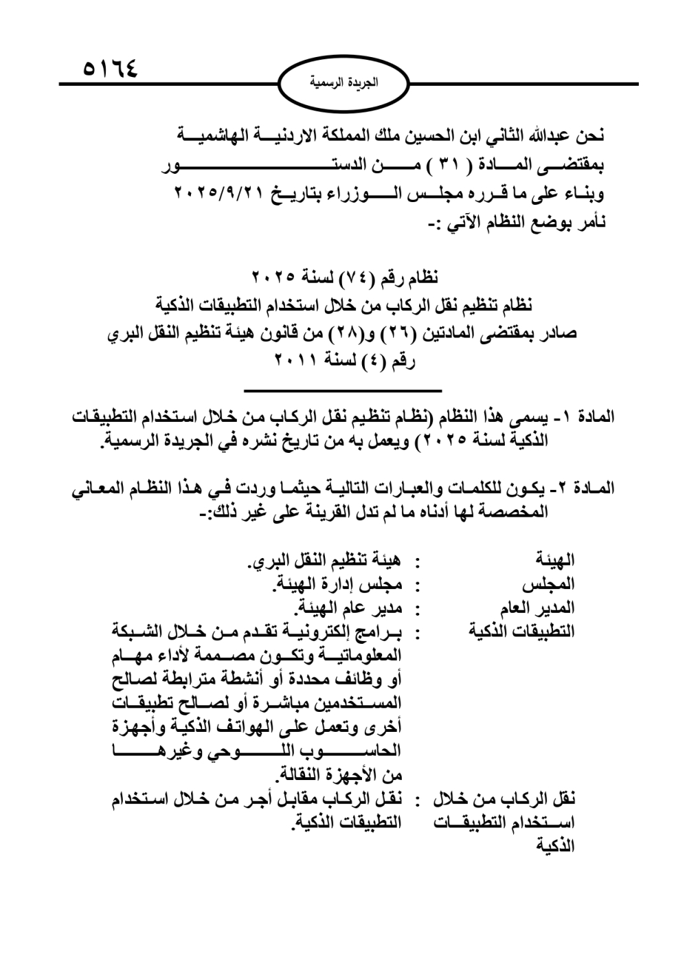 نُشر في الجريدة الرسمية، الخميس، نظام تنظيم نقل الركاب من خلال استخدام التطبيقات الذكية لسنة 2025، وتاليا نص النظام: