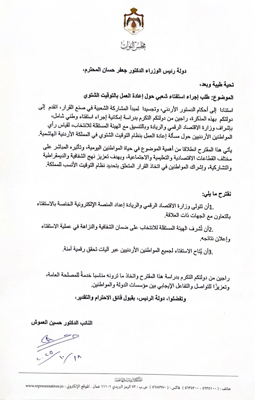 تقدّم النائب الدكتور حسين العموش بمذكرة رسمية إلى رئيس الوزراء الدكتور جعفر حسان، طالب فيها بإجراء استفتاء شعبي يخص إعادة العمل بنظام التوقيت الشتوي في المملكة الأردنية الهاشمية.