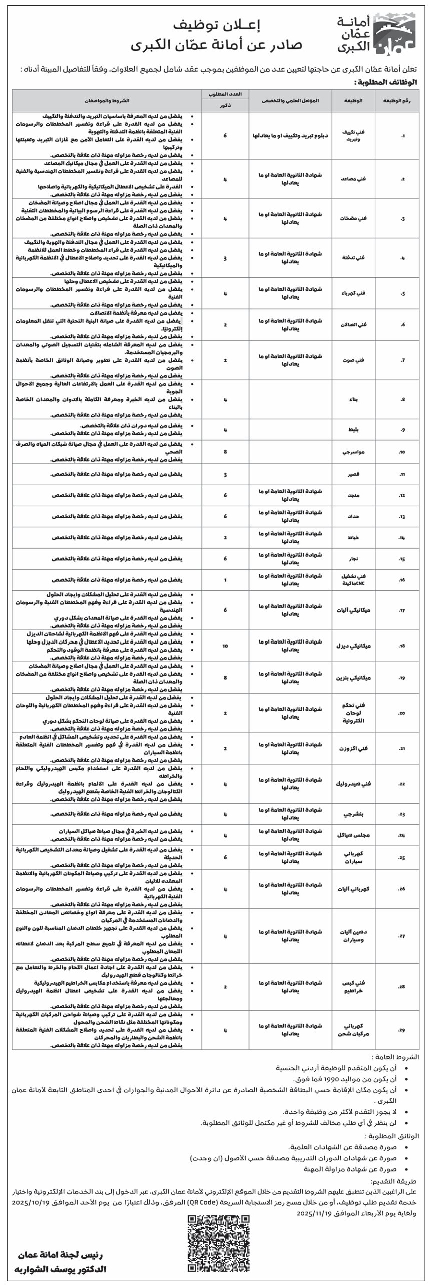 أعلنت أمانة عمان الكبرى اليوم الأحد عن حاجتها لتعيين عدد من الموظفين الجدد بموجب عقد شامل لجميع العلاوات. وجاء الإعلان وفق التفاصيل والشروط الموضحة من قبل الأمانة، بهدف تعزيز الكوادر البشرية ودعم تقديم الخدمات العامة بكفاءة أعلى.